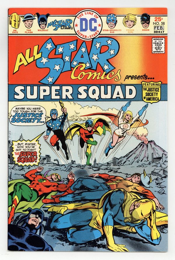 Starts Apr 4 1st appearance of Power Girl. Cover art by Mike Grell. The Super Squad! starring the All Star Super Squad, script by Gerry Conway, pencils by Ric Estrada, inks by Wally Wood; Power Girl describes the Super Squad as a strike force composed of the JSA and the three younger heroes--Robin, Power Girl, and Star-Spangled Kid. Letters from Roy Thomas and Jerry Bails. The Captive Commissioner Hostess ad starring Batman, pencils by Curt Swan, inks by Vince Colletta. 36 Pages, Full Color. Cover price $0.25.