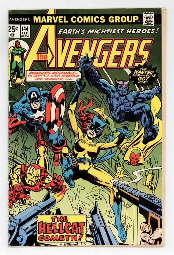 Starts Apr 20 "Claws!" Part 4 of 7. First appearance of Hellcat. Script by Steve Englehart. Pencils by George Perez. Inks by Mike Esposito. Cover by Gil Kane and Frank Giacoia. The Avengers are free inside the Brand Corporation's Long Island facility! However, it doesn't take long for Hugh Jones and Buzz Baxter to locate them and activate the plant's internal military-grade weapons! During the missile attack, the Avengers are forced to split up. The Beast, Vision, and Scarlet Witch go one way...and Captain America, Iron Man, and Patsy Walker go another! When Shell-head comes across the former uniform of the Cat, the shield-slinger gets an idea! And in a dazzling transformation...Patsy Walker becomes Hellcat! The Avengers could use another hero on their side, because the rematch with Doctor Spectrum, the Golden Archer, Hyperion, Lady Lark, and the Whizzer is coming up fast! An excellent issue! The story (part 5) continues in Avengers 147. Origin of Patsy Walker. Cameo appearances by the Two-Gun Kid, Hawkeye, Moondragon, and Thor. Flashback cameos by the Fantastic Four, Spider-Man, and Tigra. (Notes: The letters page includes letters from comics writer Peter Gillis and comics writer Mary Jo Duffy, respectively. The letters page also contains Marvel Value Stamp Series B #39 Thor by Jack Kirby.) 36 pgs. Cover price $0.25.