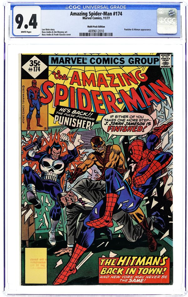 Starts May 11 Whitman Variant. "The Hitman's Back in Town!" Part 1 of 2. Guest-starring the Punisher. Script by Len Wein. Art by Ross Andru (breakdowns), Jim Mooney (finishes), and Tony DeZuniga (finishes). Cover by Ross Andru and Frank Giacoia. The Hitman is back! And he's got a brand new target: J. Jonah Jameson! But there's another gun-toting vigilante back in town too: the Punisher! And he's tracking the Hitman! Mix in the wondrous wall-crawler...and as shown on the dynamic cover, all concerned parties come together in JJJ's corner office! Pandemonium erupts when the bullets start flying! Stay down Jonah! Let Spidey and the Punisher take the hit (man)! Cameo appearances by Harry Osborn, Flash Thompson, Dr. Marla Madison, and Dr. Bart Hamilton. First 35ยข issue. (Notes: The Hitman previously appeared in Spectacular Spider-Man 5. This story was reprinted in Marvel Tales 216.) 32 pages Cover price $0.35.