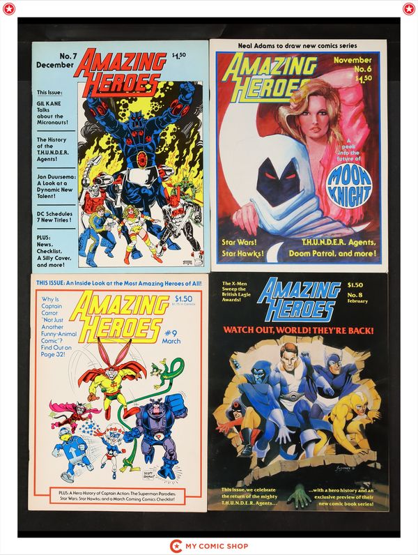 Issues 6, 7, 8, 9 of Amazing Heroes (1981). Most will grade in the FN to FN/VF range.