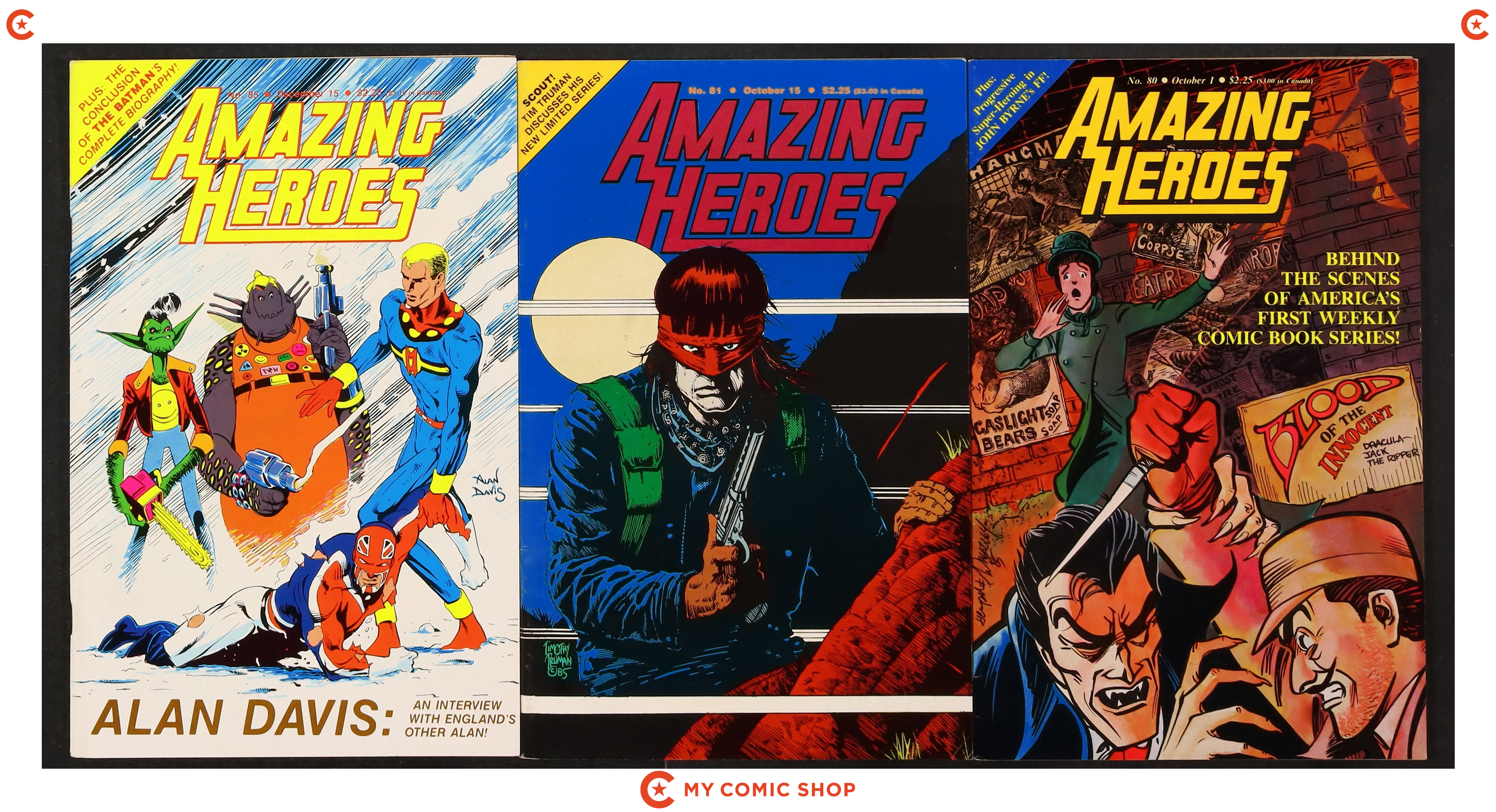 Issues 80, 81, and 85 of Amazing Heroes (1981). Most will grade in the FN range.