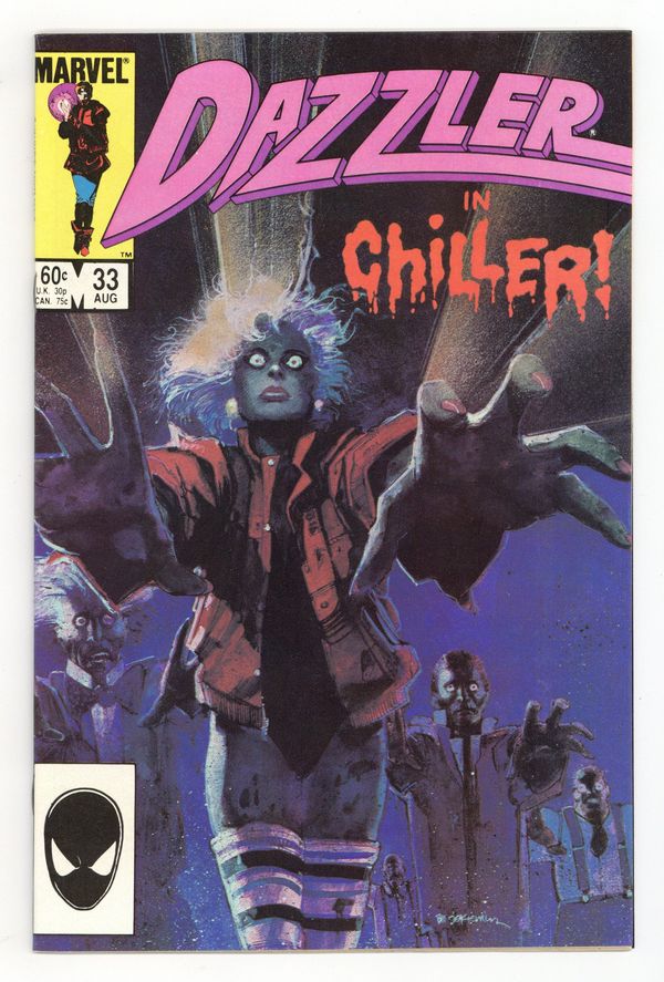 Starts Mar 9 Direct Edition. Painted cover art by Bill Sienkiewicz. Chiller!, script by Mike Carlin, pencils by Mark Bright, inks by Vince Colletta; Ali lands a job in a music video that bears an uncanny resemblance to Michael Jackson's Thriller. 36 pgs. $0.60. Cover price $0.60.