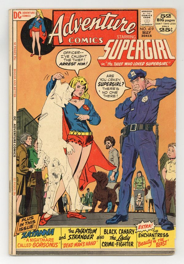 Starts May 18 48-page giant. Cover art by Bob Oksner. The Thief Who Loved Supergirl, script by John Albano, pencils by Tony DeZuniga, inks by Bob Oksner. Circle of Doom Part Two starring Black Canary, script by Denny O'Neil, art by Alex Toth; Black Canary battles The Catwoman. A Nightmare Called Gorgonus! starring Zatanna and Gorgonus, script by Len Wein, art by Dick Giordano. Dead Man's Hand! starring the Phantom Stranger, script by John Broome, pencils by Carmine Infantino, inks by Frank Giacoia. Beauty vs. the Beast starring Enchantress, script by Bob Haney, art by Jay Scott Pike. Letters to the editor from comics writers Paul Kupperberg and David Michelinie. 52 Pages, Full Color. Cover price $0.25.