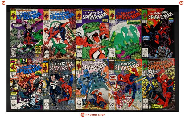 Issues 321D, 322, 324, 325, 326D, 327D, 328D, 329, 330D, 331D of Amazing Spider-Man (1963 1st Series). Most will grade in the FN/VF to VF/NM range, with 326 grading at VG+.