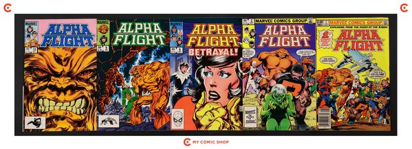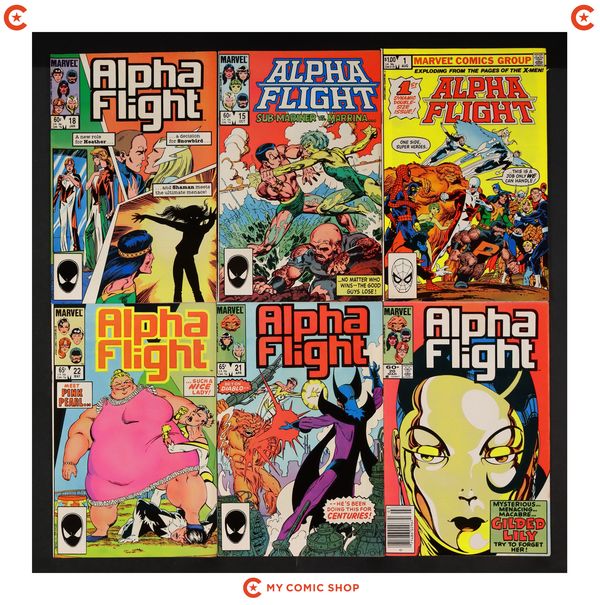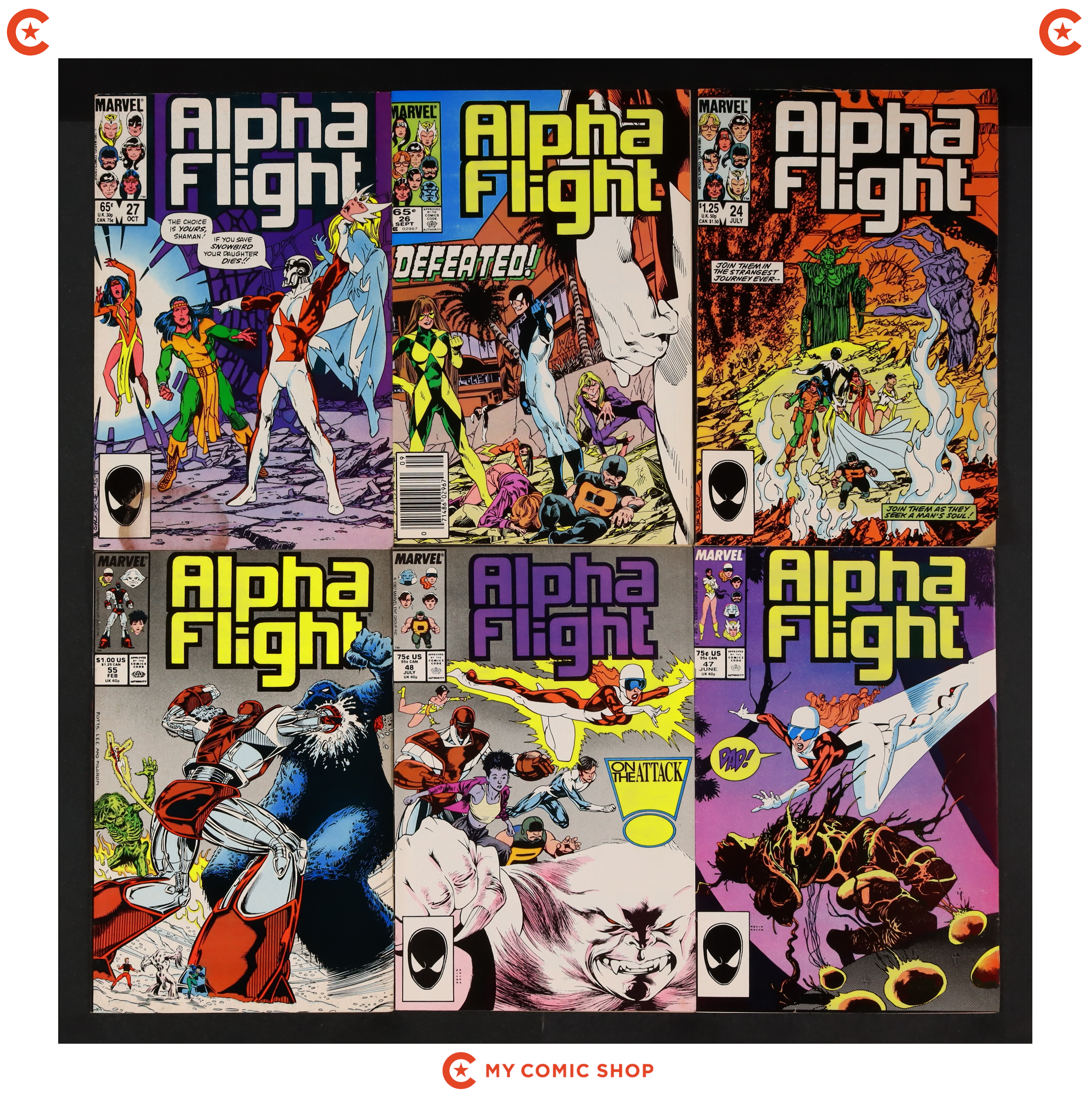 Issues 1, 15, 18, 20N, 21, 22, 24, 26N, 27, 47, 48, and 55 of Alpha Flight (1983 1st Series). Most will grade in the FN range with a couple grading VG.