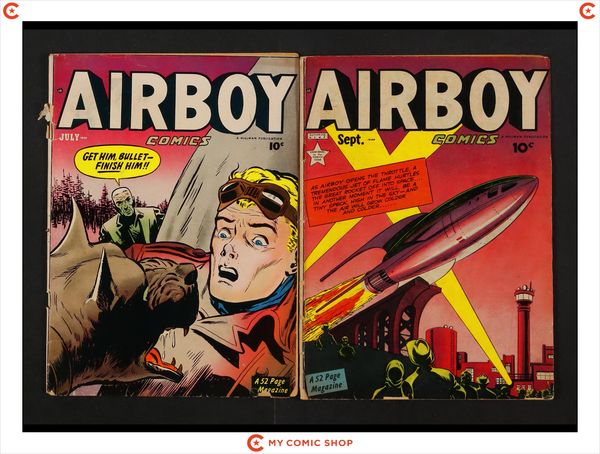Issues Vol. 6 #8 and Vol. 7 #6 of Airboy Comics (1945-1953 Hillman). Most will grade in the GD to VG range.