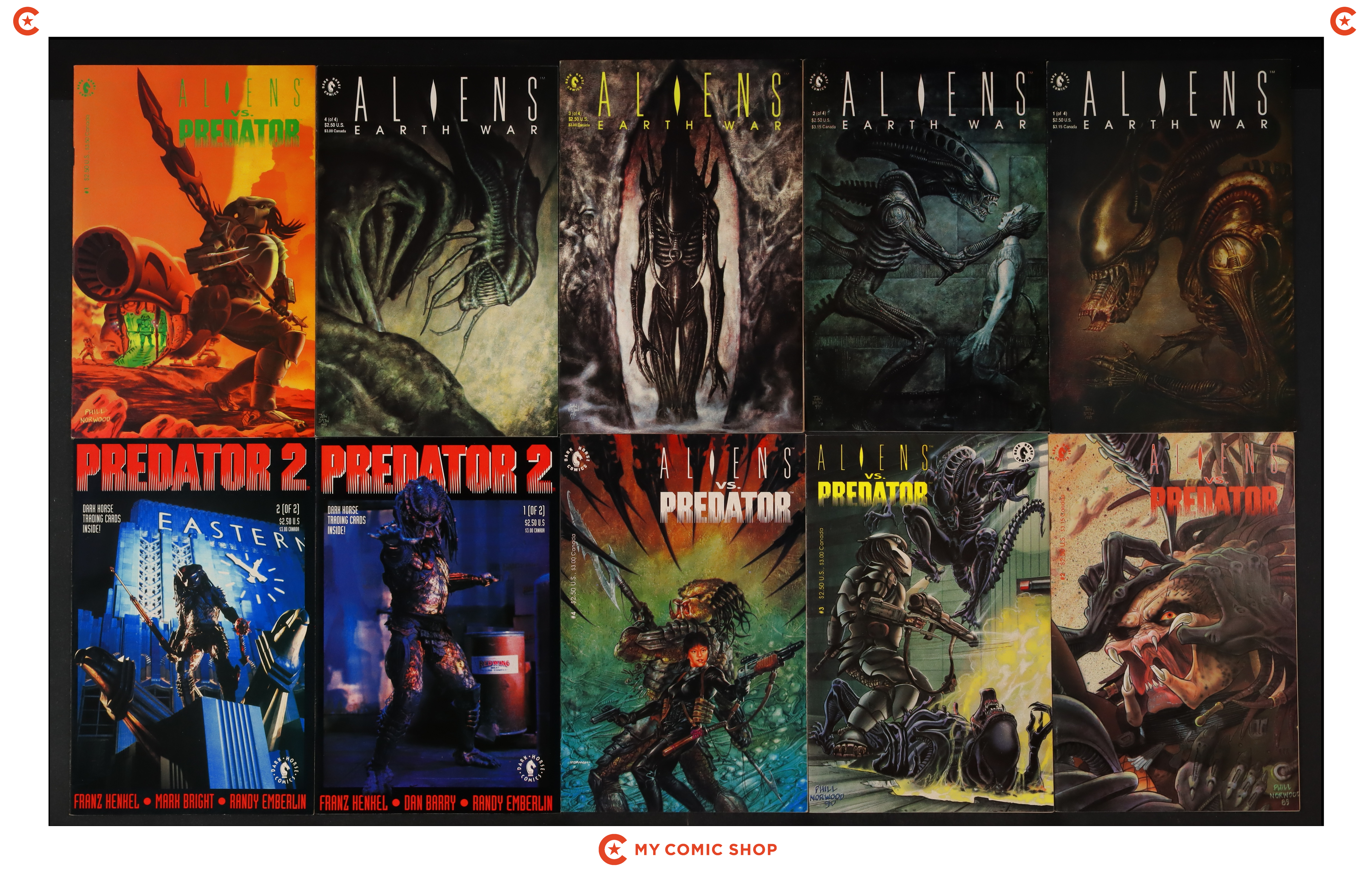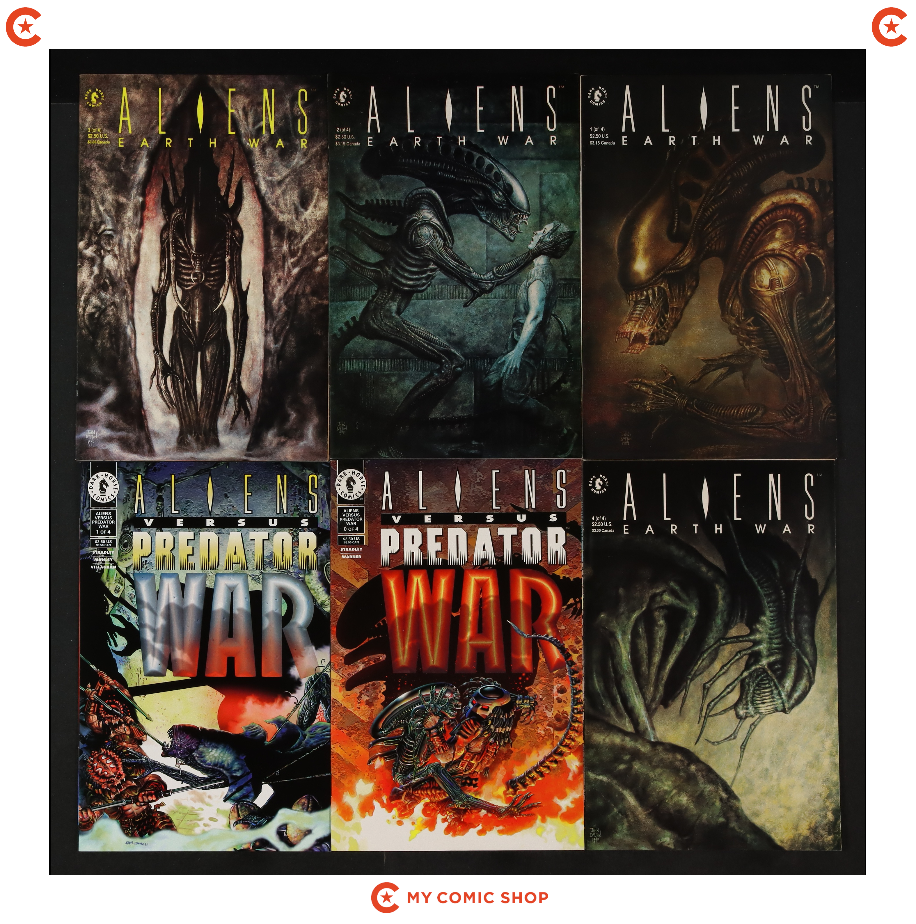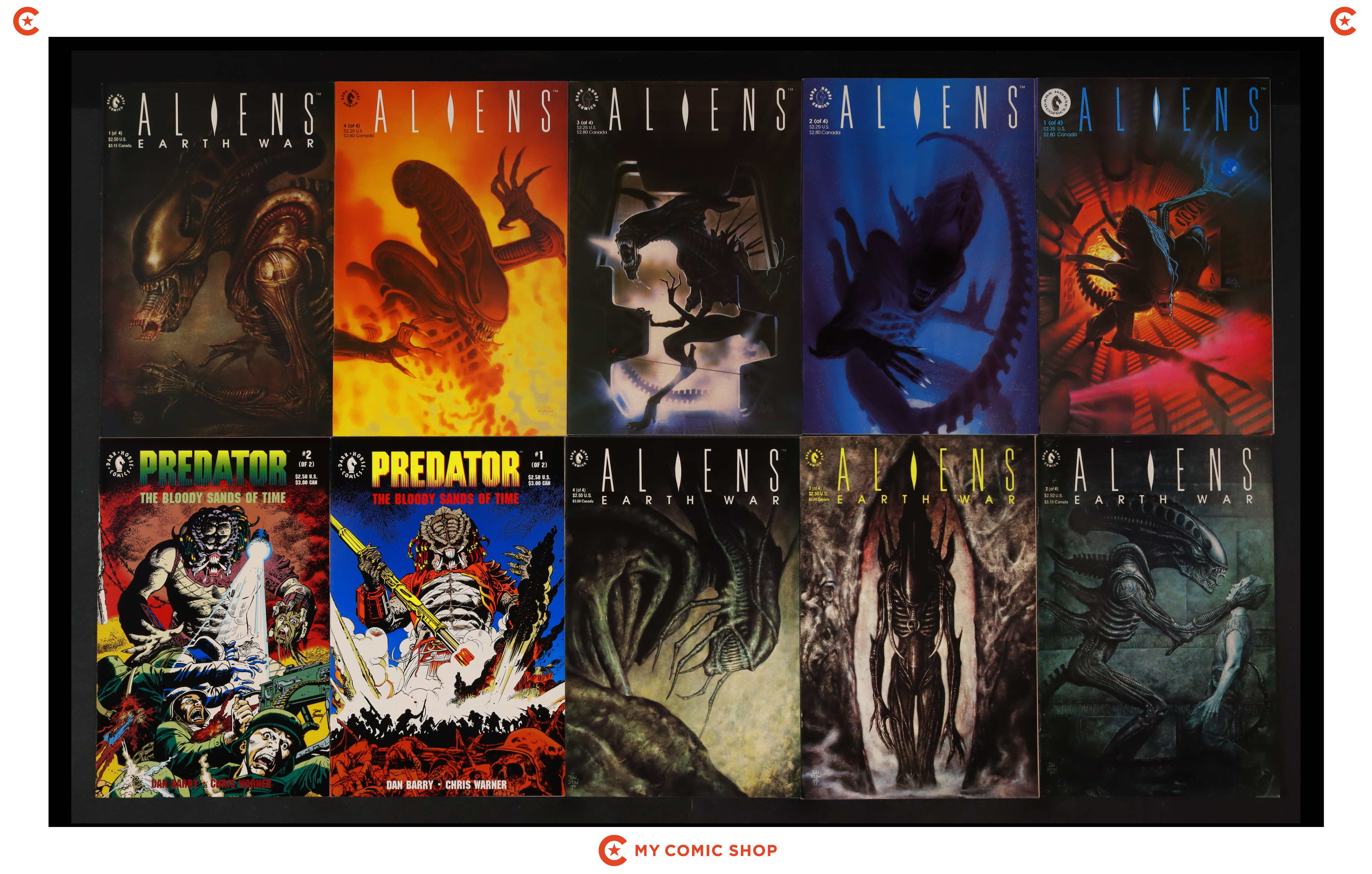 Issues Issues 1-4 of Aliens (1989 Dark Horse), issues 1-4 of Aliens Earth War (1990), and issues 1-2 of Predator The Bloody Sands of Time (1992). Most will grade in the FN to VF range.