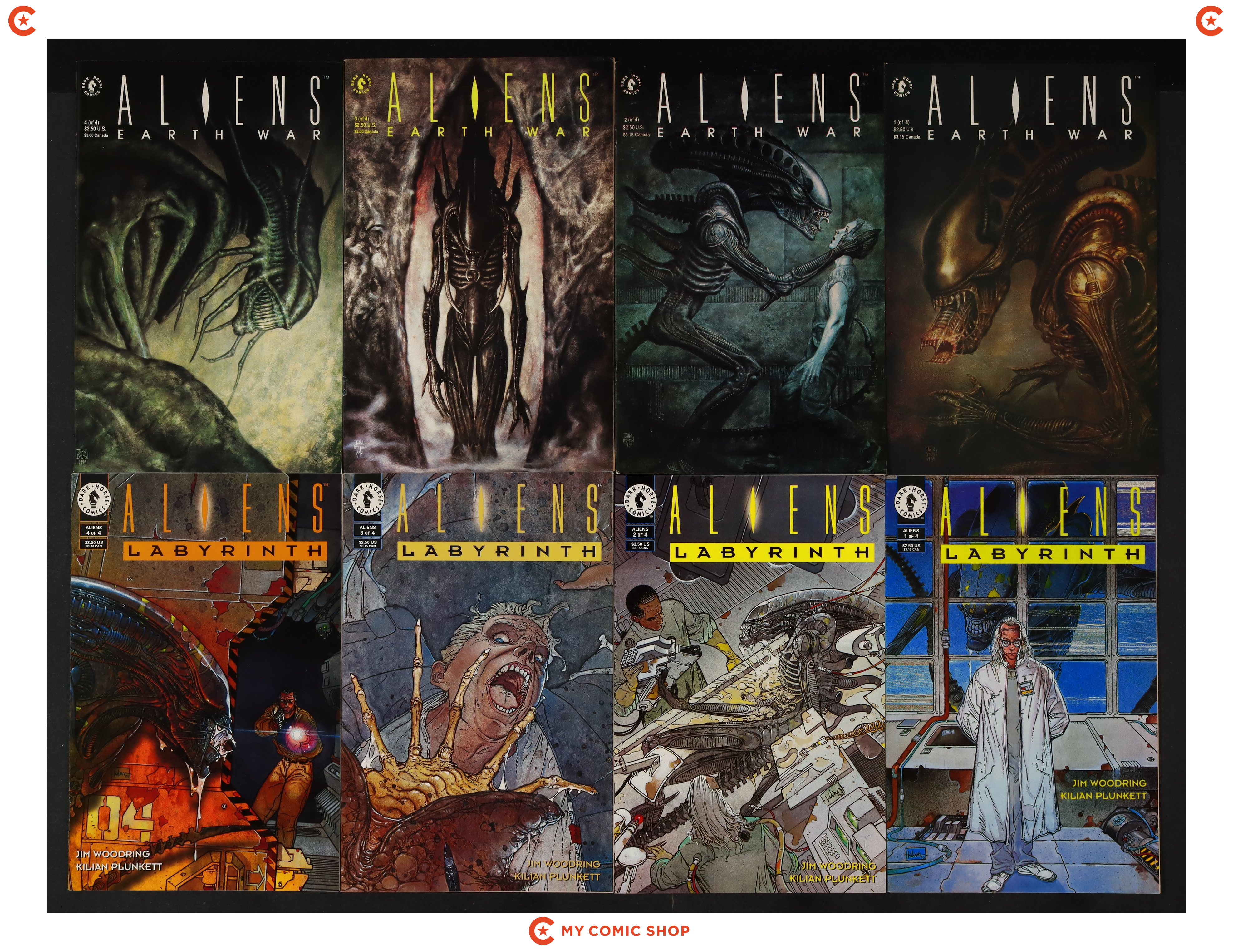 Issues 1-4 of Aliens Earth War (1990), issue 1-4 of Aliens Labyrinth (1993), and issues 1-3 of Alien 3 Movie Adaptation (1992). Most will grade in the FN to VF range.