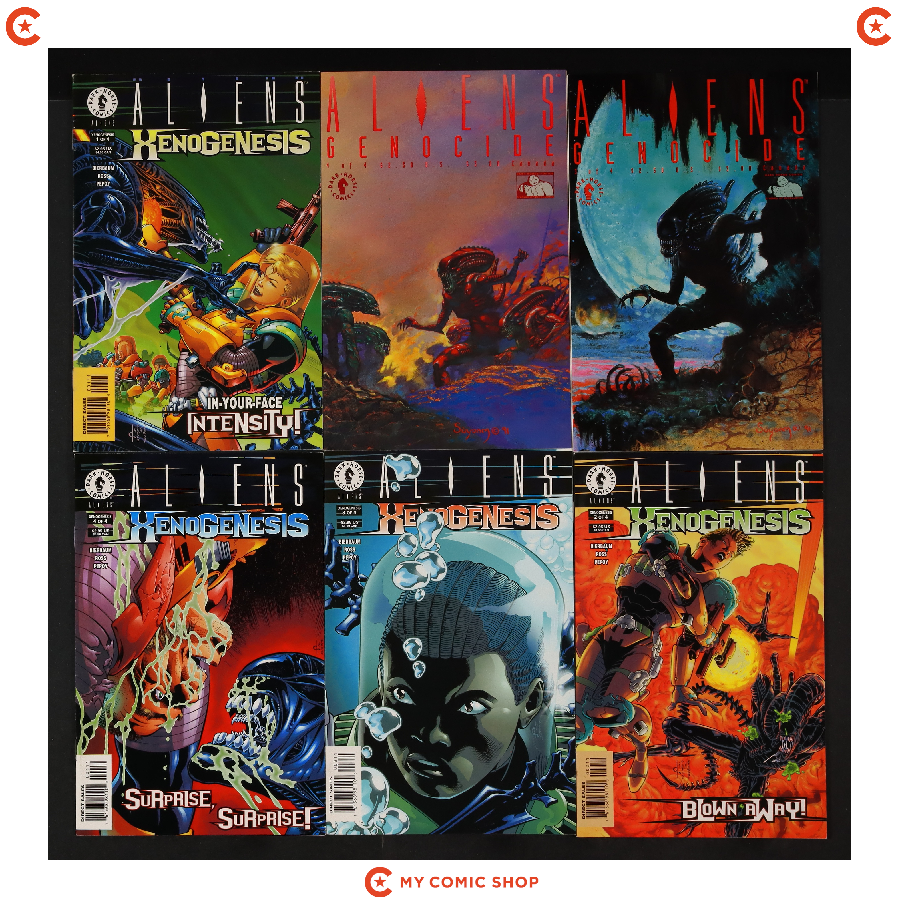 Issues 1-4 of Aliens Earth War (1990), issues 1-4 of Aliens Genocide (1991), and issues 1-4 of Aliens Xenogenesis (1999). Most will grade in the FN to VF range with #1, #2 of Aliens Earth War (1990) grading VG.