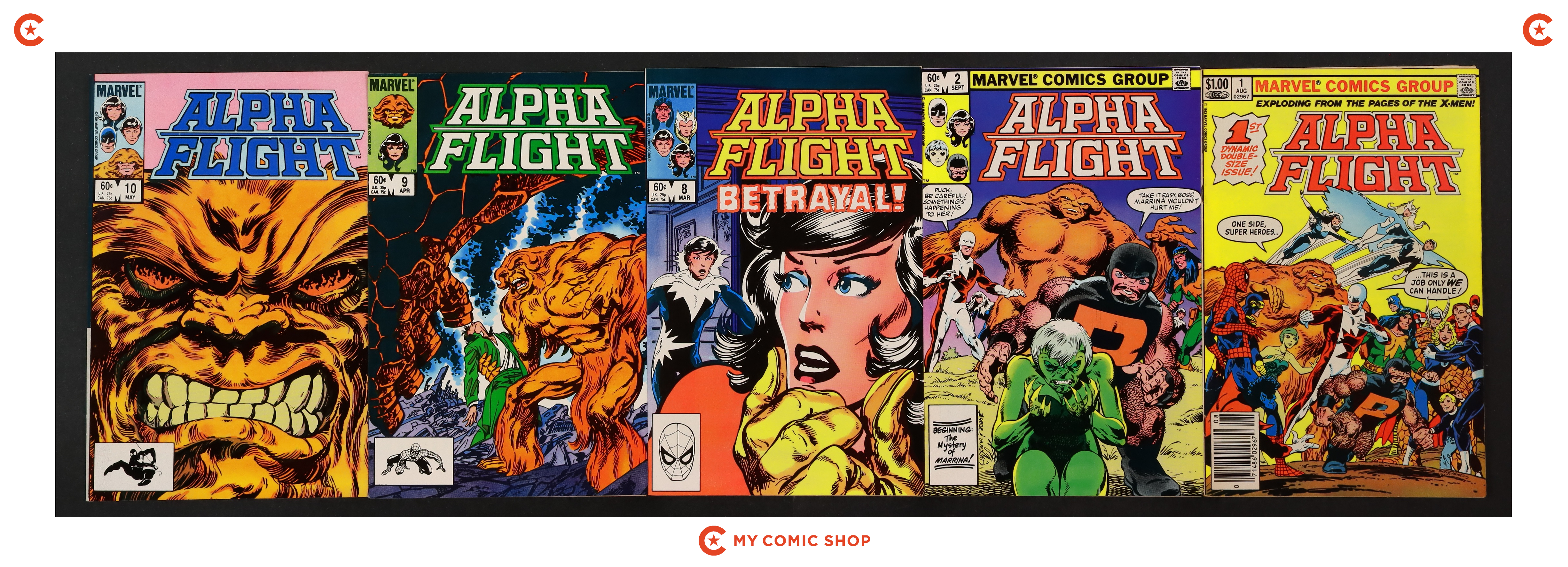 Issues 1N, 2, 8, 9, 10 of Alpha Flight (1983 1st Series). Most will grade in the FN to VF range with #1 grading VG.