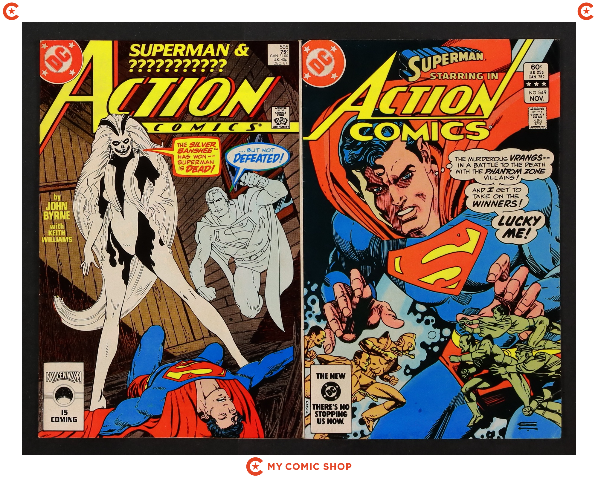 Issues 549, 595D of Action Comics (1938 DC). Most will grade in the VG to FN range.