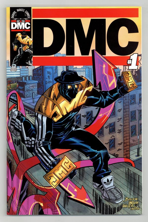 In this 1985, however, the city's brand new guardian angels wear spandex and capes, wielding their gadgets and their superpowers to clean up the City, even if their methods hurt more people than they help. It seems like only some of New York's residents are benefitting from these vigilantes' protection. The rest whisper the name of another hero: DMC. He dons his tracksuit and Adidas sneakers to defends the city's marginalized citizens against super villain and super hero alike, leaving no traces besides the imprint of his knuckle rings on his opponents' faces.