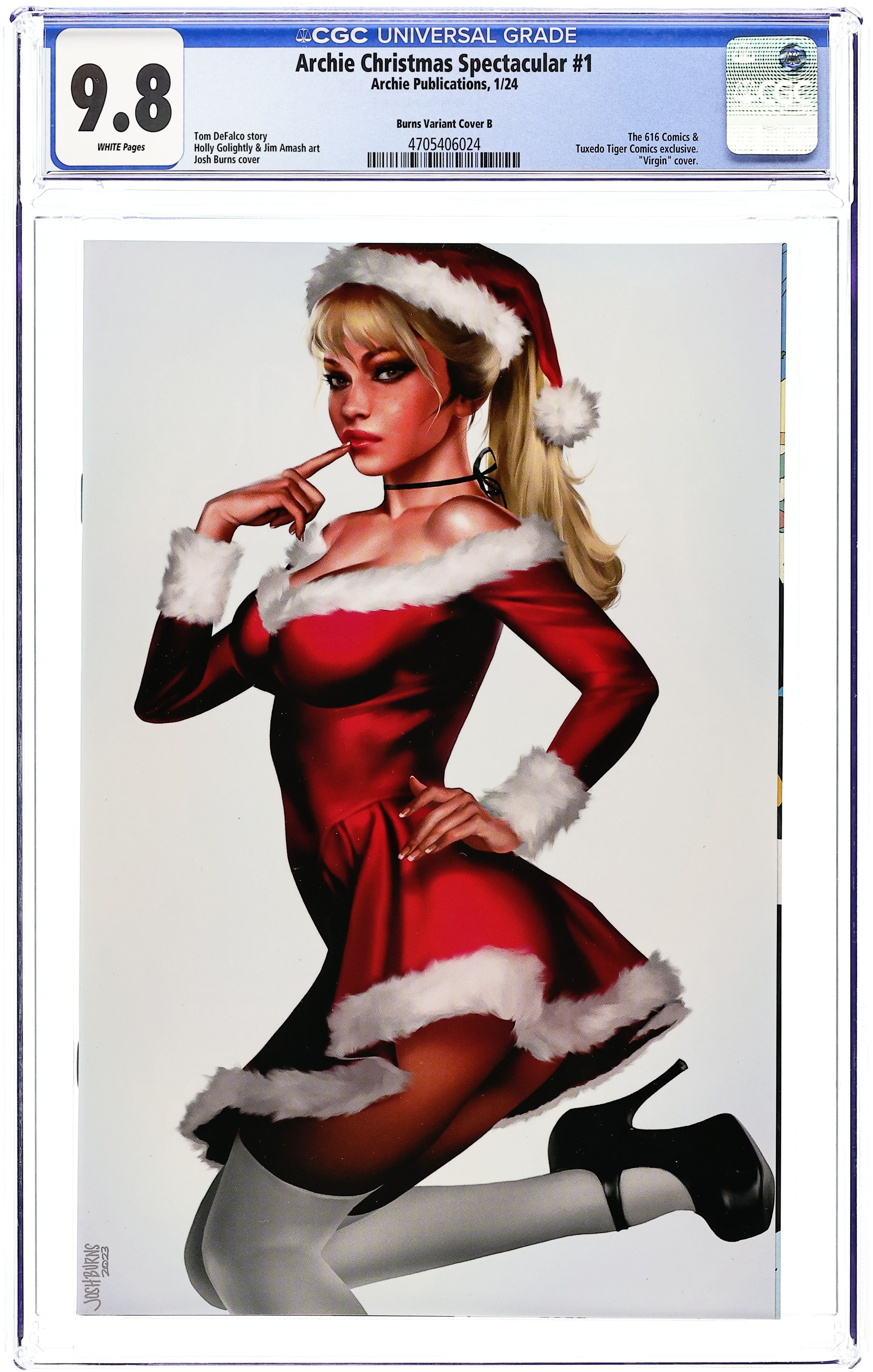 Starts May 11 The 616 Comics and Tuxedo Tiger Exclusive "White" Virgin Cover by Josh Burns. Written by Tom DeFalco. Art by Holly G. BRAND NEW STORY: 'Christmas Chaos!' Christmas goes from nice to naughty for Archie and his friends when Jingles and Sugarplum are replaced by their bizzarro counterparts Jangles and Sourplum and a cranky ol' version of Santa called Grumpus! All that plus more holiday hijinks! 32 pages, full color. NOTE: Generic image is of a signed copy, this does not necessarily reflect all copies. Cover price $1.00.