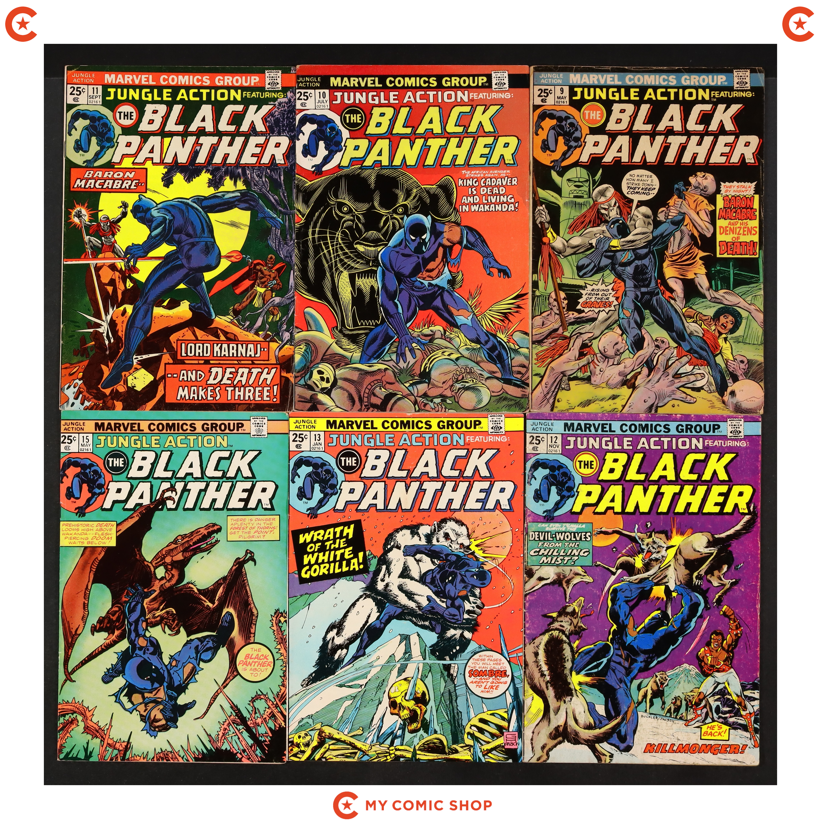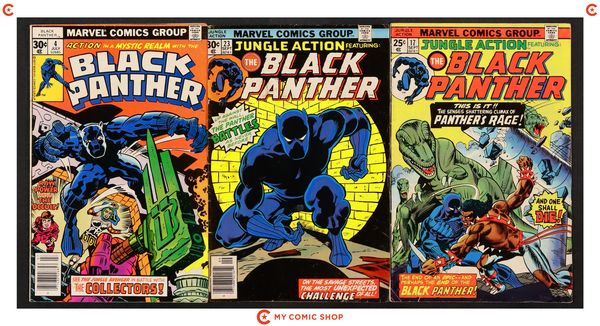 Issues 9-13, 15, 17, and 23 of Jungle Action (1972 Marvel); and 4 of Black Panther (1977 Marvel 1st Series). Most will grade in the VG range with a few grading closer to GD.