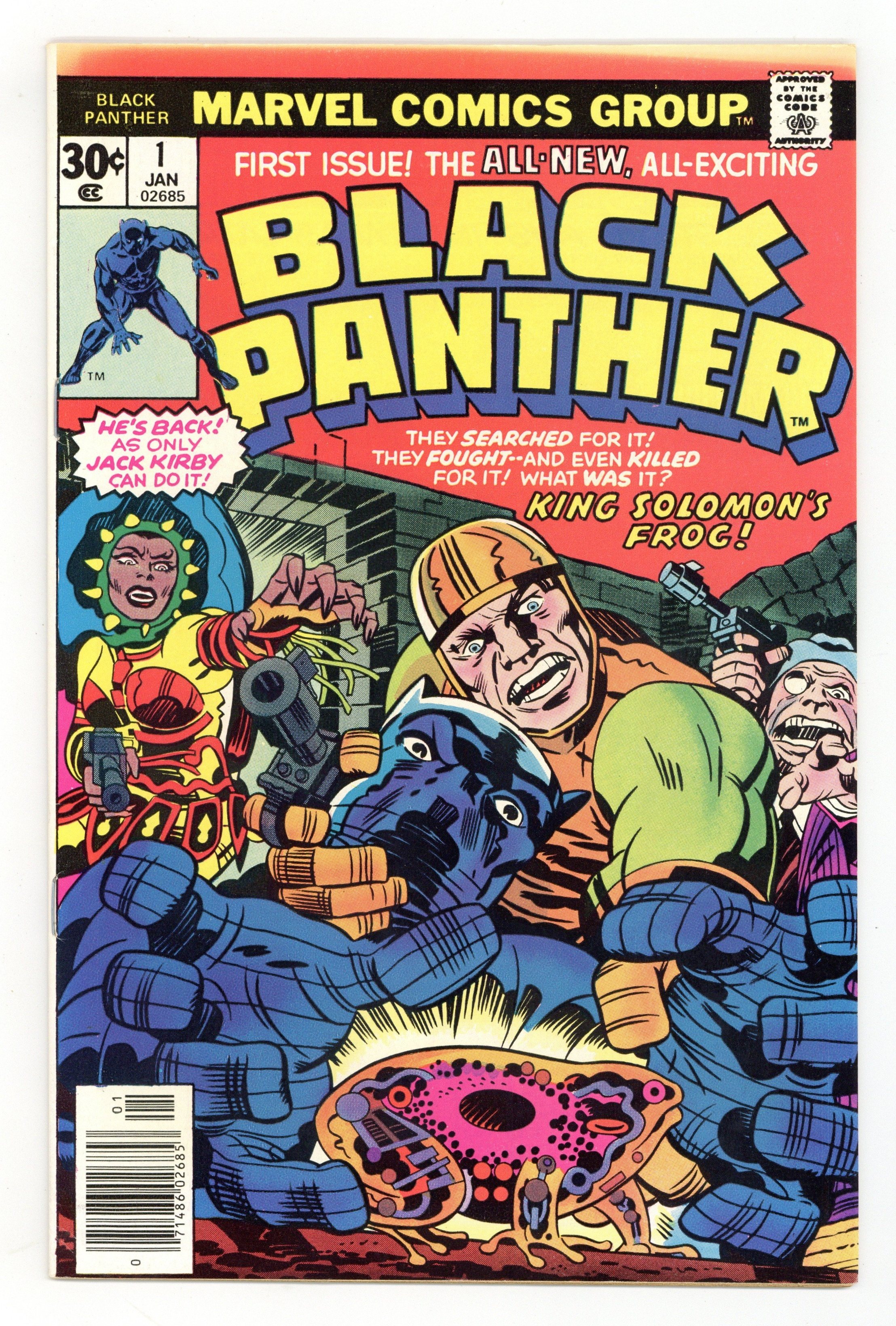 Starts Apr 4 Cover pencils by Jack Kirby, inks by John Verpoorten. King Solomon's Frog!, script and pencils by Jack Kirby, inks by Mike Royer; Black Panther helps Abner Little, a member of the Collectors, recover the Brass Frog, an ancient time machine; Due to its dangerous nature, the Frog had previously been hidden away by the Black Panther's grandfather, Azzuri, but was taken by Alfred Queely, a fellow member of the Collectors; After getting the Frog, the Black Panther and Little are attacked by Princess Zanda, another member of the Collectors, for control of the artifact. During the battle, the Frog is activated and a mysterious creature, Hatch-22, appears. Jack Kirby writes about what readers can expect from his new Black Panther. 36 pgs. $0.30. Cover price $0.30.