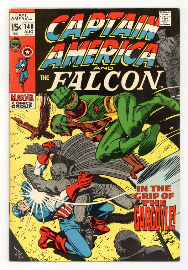 Starts Apr 27 "In the Grip of Gargoyle!" Part 2 of 4. Script by Stan Lee. Pencils by John Romita Sr. Inks by George Roussos. Cover by John Romita Sr. Inside a stonecutter's storage yard, the Sentinel of Liberty and the Falcon battle the Grey Gargoyle! The heroes know they cannot let the gargoyle touch them...or they will turn to stone! The best Cap and his partner can do is fight the super-strong villain to a standstill -- and then free the missing policemen. Afterwards, while the shield-slinger meets with the policecommissioner, Redwing tracks the Grey Gargoyle's movements. And the Falcon decides to challenge the gargoyle on his own! Will Sam Wilson be the next person turned to stone? Retelling of the Grey Gargoyle's origin. Cameo appearances by Commissioner Feingold, Brian Muldoon, Leila Taylor, NickFury, Dum Dum Dugan, and Sharon Carter. 36 pages. Cover price $0.15.