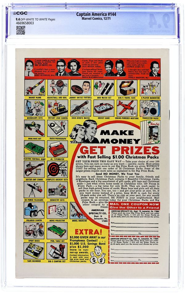 Tags: Marvel Legacy Numbering: Captain America (part 144), Captain AmericaCaptain America (1968 1st Series) 144 CGC 9.4