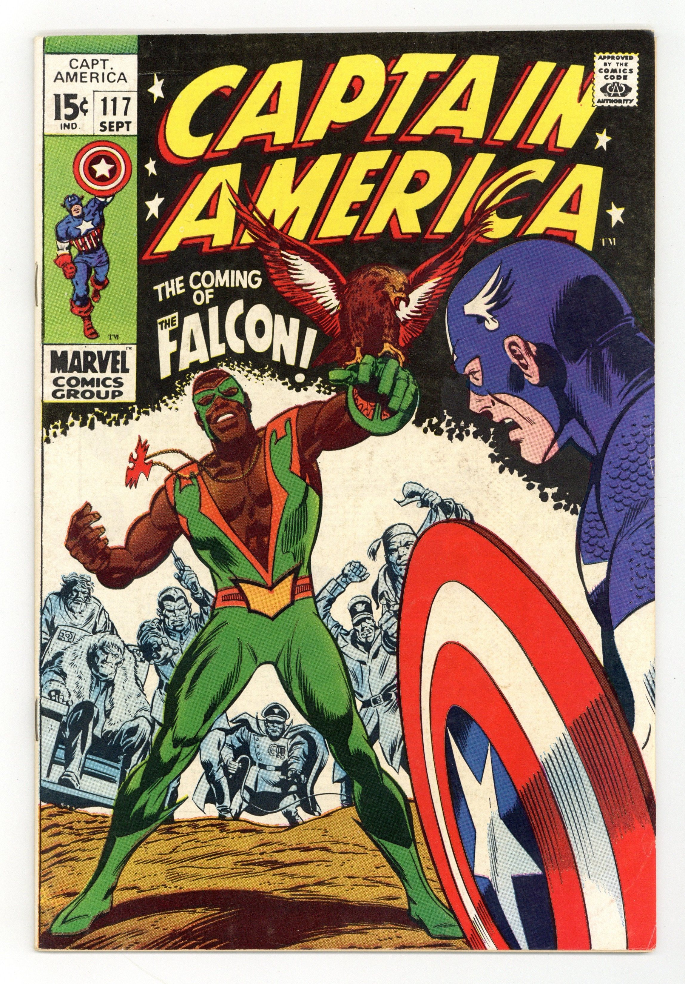 Starts Apr 4 Cover pencils by Gene Colan and John Romita (alterations), inks by Joe Sinnott and John Romita (alterations). First appearance and origin of the Falcon in "The Coming of... the Falcon!", script by Stan Lee, pencils by Gene Colan, inks by Joe Sinnott; With the Red Skull previously having switched bodies with Captain America, the Skull uses the Cosmic Cube to send Cap to the tropical island home of the Exiles; There Cap encounters a falconer from Harlem who had been hired by the Exiles but who is now attempting to help the island natives kick the Exiles from their home; Cap joins forces with the falconer who, with Cap's urging, dons a costume and takes the name the Falcon. Letter to the editor from writer James Van Hise. 36 pgs., full color. $0.15. Cover price $0.15.