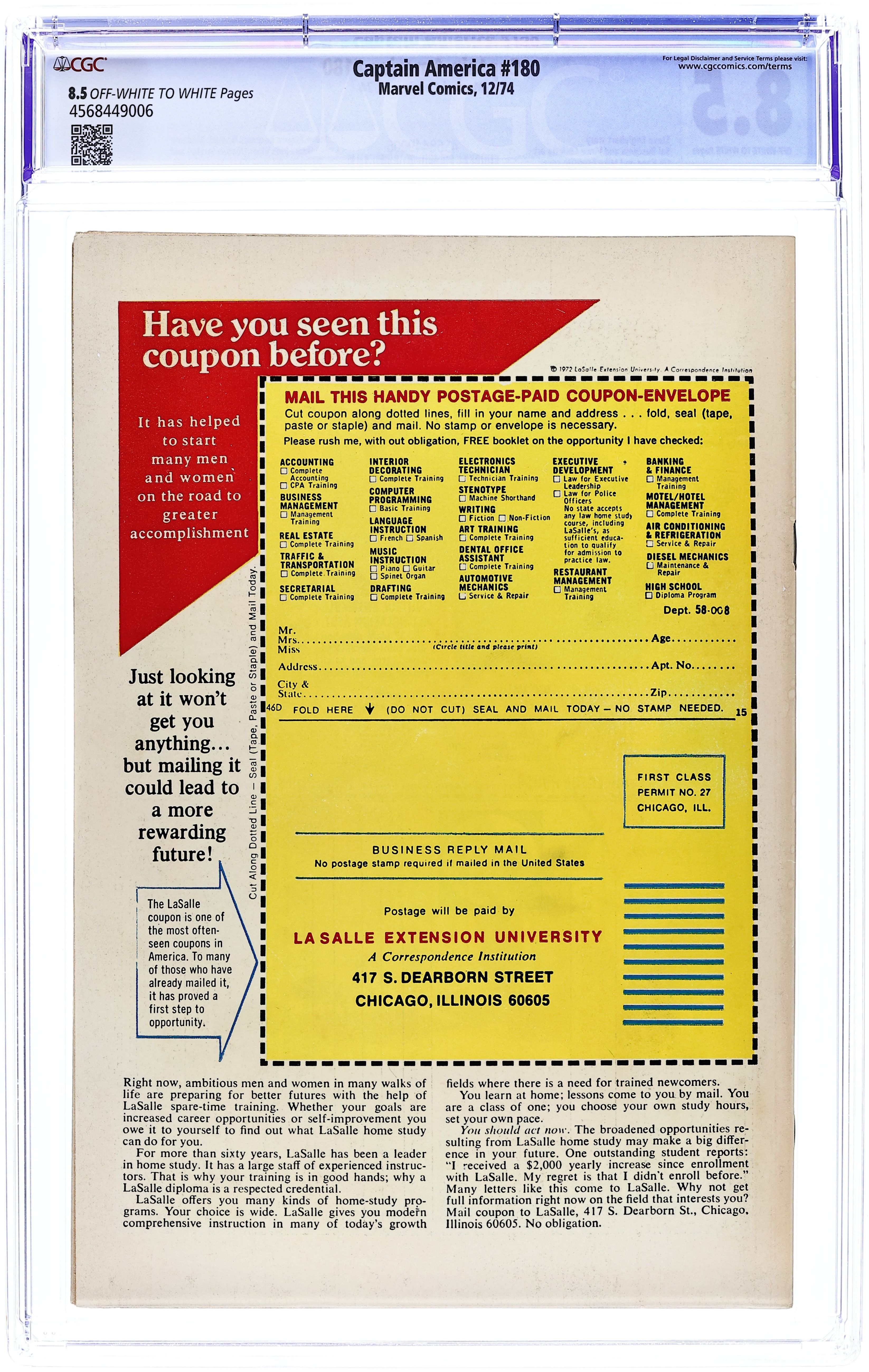 Tags: Marvel Legacy Numbering: Captain America (part 180), Captain AmericaCaptain America (1968 1st Series) 180 CGC 8.5