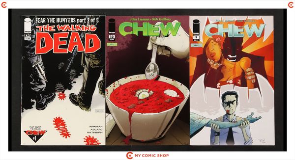 Issue 63 of Walking Dead (2003 Image), and issues 1C, 2B, 3A, 4A, 5, 6, 7, 8, 9, 10 of Chew (2009). Most will grade in the VF to NM range with #10 grading VG.