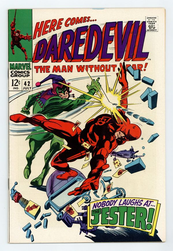 Starts Apr 27 Cover pencils by Gene Colan, inks by Frank Giacoia (photo Background). The Dismal Dregs of Defeat, script by Stan Lee, pencils by Gene Colan, inks by Vince Colletta; With the police thinking he is a murderer, Daredevil tries to avoid the law but is captured by the Jester and sent to jail. Letters to the editor from Tony Isabella, Peter Sanderson, and Ted White. 36 pgs. Cover price $0.12. Cover price $0.12.