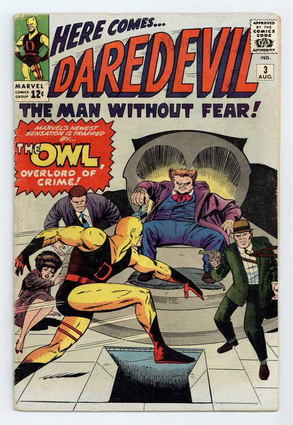 Starts Apr 27 Cover pencils by Jack Kirby, inks by Vince Colletta. Origin and first appearance of the Owl inThe Owl, Ominous Overlord of Crime!, script by Stan Lee, pencils by Joe Orlando, inks by Vince Colletta; A wealthy and ruthless financier is exposed as a criminal and begins his reign as the Owl; The Owl hires Matt Murdock to get him out of his legal troubles; The Owl gathers a gang, traps DD and Karen and begins his bid to rule the underworld; DD escapes and takes the Owl down. 36 pgs. Cover price $0.12. Cover price $0.12.