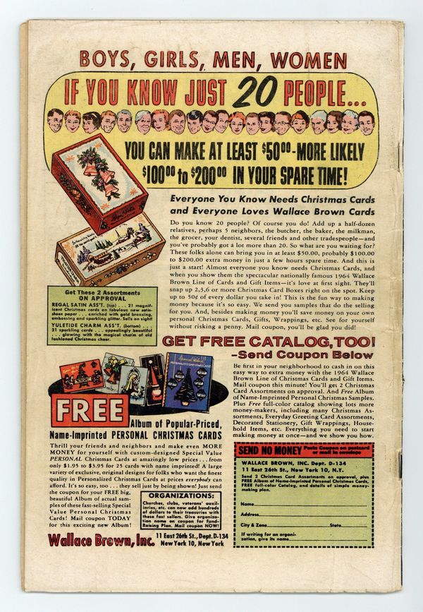 Starts Apr 4 Cover art by Wally Wood. First appearance of Mr. Fear in "Trapped by the Fellowship of Fear!" Script by Stan Lee, art by Wally Wood. The Fellowship of Fear includes Mr. Fear, the Ox, and the Eel. Cameos (Mr. Fear's sculptures) by Captain America, Electro, the Owl, Rama-Tut, Mysterio, Spider-Man, the Chameleon, Dr. Doom, the Hatemonger, Diablo, the Beetle, Kraven, Baron Zemo, Iron Man, the Toad, Mr. Doll, the Black Knight, Egghead, the Hulk, the Melter, Cyclops, the Vulture, the Thing (of the Fantastic Four), Dr. Octopus, Dr. Strange, Loki, Thor, the Super Skrull, the Cobra, Magneto, Giant Man, and the Green Goblin!; DD intrudes on a phony movie shoot where the Fellowship of Fear is robbing a bank and gets himself blasted by fear gas; Mr. Fear decides to flush DD out by creating a wax figure of Hornhead for his museum; DD and Foggy both get in a brawl with the Fellowship, and Foggy is injured; DD returns to the wax museum to put an end to the Fellowship. 36 pgs. Cover price $0.12. Cover price $0.12.