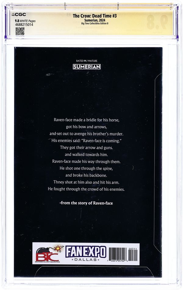 Published 2024 by Sumerian Comics.Crow Dead Time (2024 Sumerian Comics) 3BTC.B CGC 9.8 SS O'Barr
