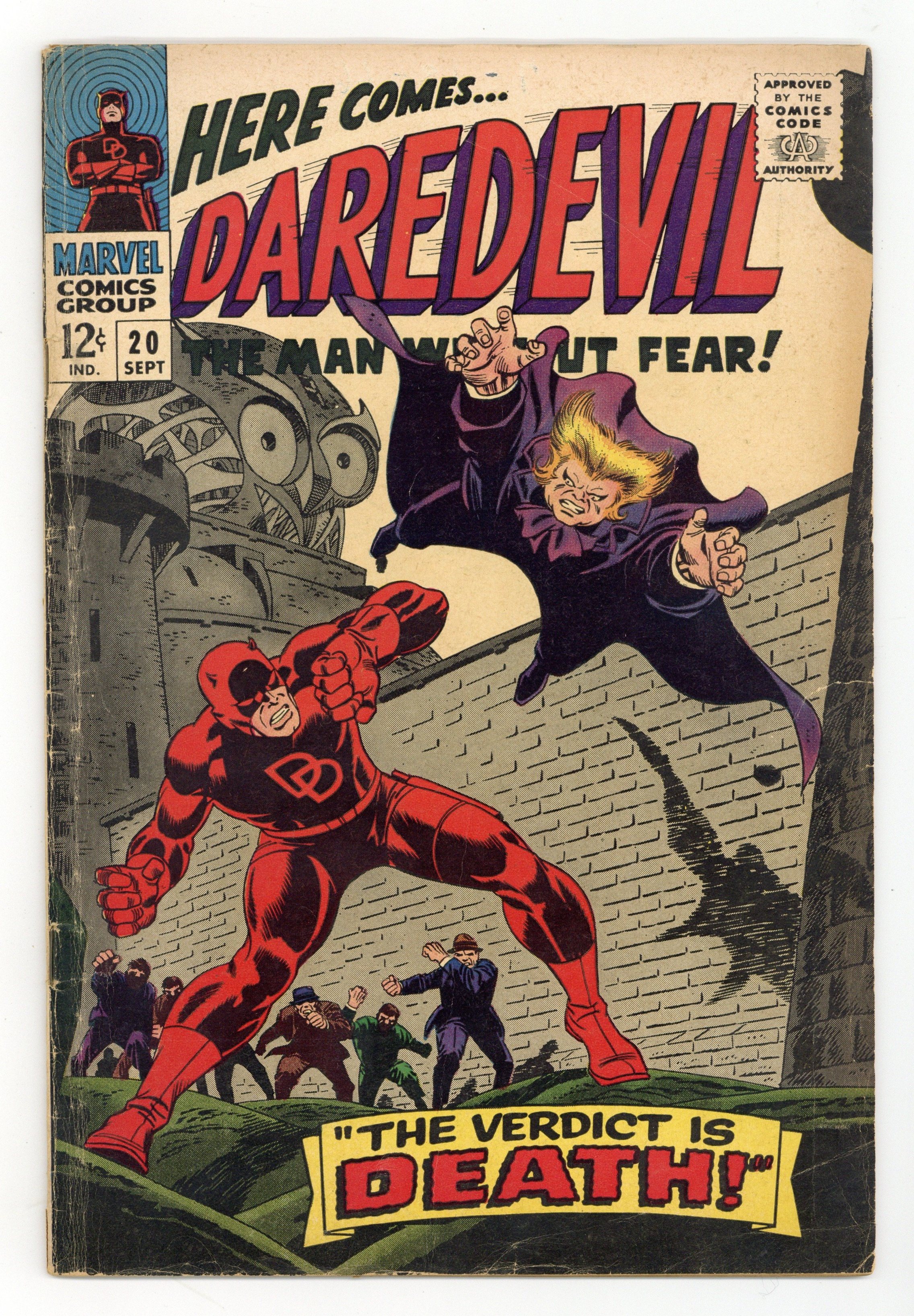 Starts Apr 27 Cover pencils by John Romita, inks by Frank Giacoia. The Owl returns in The Verdict Is: Death!, script by Stan Lee, pencils by Gene Colan (first work on the title), inks by Frank Giacoia; The Owl kidnaps Matt Murdock to be the defense attorney in a mock trial the fowlish fiend has set up for the judge who sent him to prison. Reprinted in Giant-Size Marvel Triple Action #1. 36 pgs. Cover price $0.12. Cover price $0.12.