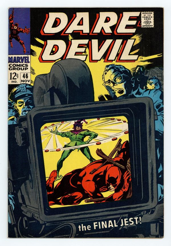 Starts Apr 27 Cover pencils by Gene Colan, inks by George Klein. The Final Jest, script by Stan Lee, pencils by Gene Colan, inks by George Klein; Daredevil has to break out of jail to clear his name of a trumped up murder charge; Once old hornhead figures out the Jester set the whole thing up, he dresses as the Jester and appears on Carson to draw out the crime clown; Jester and DD battle as the plot concludes on live TV; Johnny Carson cameo. 32 pgs. Cover price $0.12. Cover price $0.12.