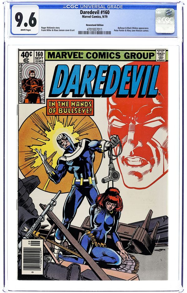 Starts Apr 4 Newsstand Edition. Cover pencils by Frank Miller, inks by Klaus Janson. In the Hands of Bullseye, script by Roger McKenzie, pencils by Frank Miller, inks by Klaus Janson; Matt and Heather visit her father's grave; Bullseye captures Black Widow to flush DD out; appearances by Peter Parker and Mary Jane Watson; cameo by J. Jonah Jameson. 32 pgs. Cover price $0.40. Cover price $0.40.
