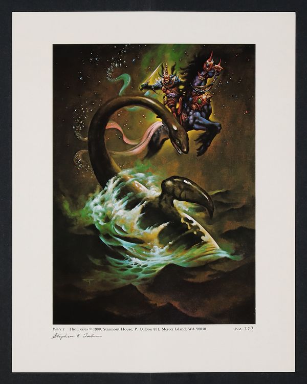 Starts May 4 SET-01 - Signed Limited Edition Portfolio. Limitation quantity not stated. Beautiful fantasy prints with an old school "pulp" feel to them. In the accompanying eight page pamphlet, Stephen Fabian provides commentary and reflections on each of the paintings. The first print is signed and numbered by the artist. Each print is titled and numbered. SET-01 includes a 11 1/2-in. x 14 1/2-in. textured-paper folder, eight 11-in. x 14-in. full-color prints, and eight page pamphlet.