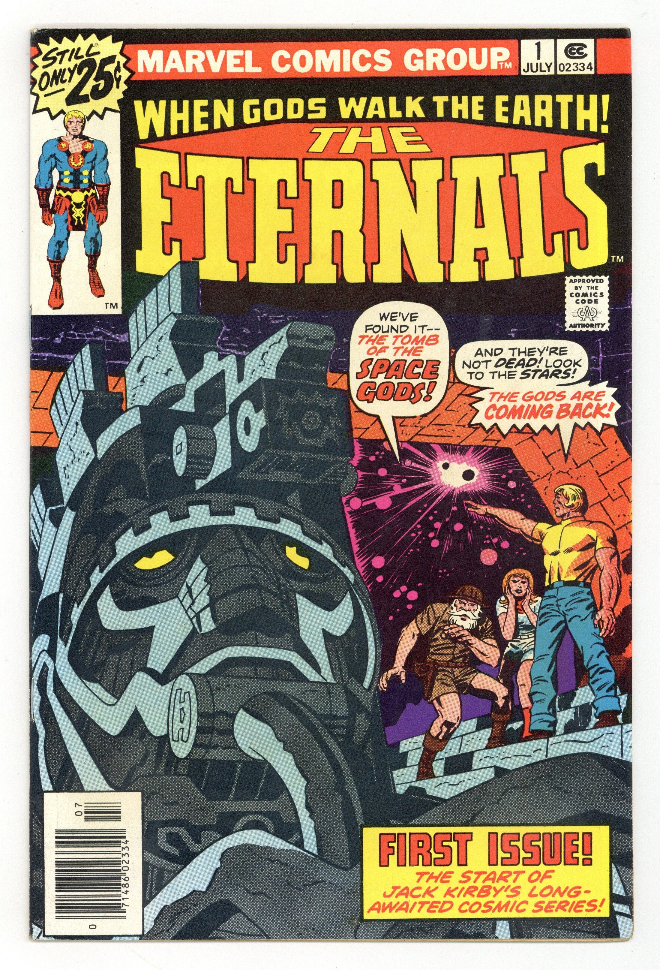 Starts Jul 4 "The Day of the Gods." Written by Jack Kirby. Pencils by Jack Kirby. Inks by John Verpoorten. What if all the stories were true? All myths...all the legends... What if all the stories about gods and monsters were true? For archeologist Doctor Damian and his daughter Margo, those legends are about to become reality. The gods are real and they've lived among us for centuries. 1st appearance of Ikaris, Makkari, Kro and the Eternals as a team . 36 pages, full color. Cover price $0.25.