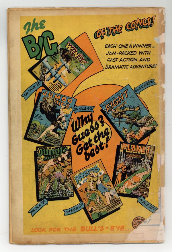 Ends Dec 22 8:54 PM CST Bid History 3 bids Current Bid $26 Your Secret Max Bid If you'd like to bid, please log in or register. Stories and art by Otto Binder, Jack Sparling, and Al Carreno. Fawcett's showcase for comics covers the humor, Western, adventure and superhero genres, featuring Captain Marvel Jr., Bulletman and Bulletgirl. Captain Marvel, Jr. meets the Upside Downies, who walk on their hands and eat with their feet. "International policeman" Radar battles a rival "international police" organization in the African nation of Liberia. A luggage mix-up puts the Terrible Tiara in the bag of Nyoka, the Jungle Girl, but gangsters want it too. Radar: The World Gauleiters; Nyoka, the Jungle Girl: The Adventure of the Terrible Tiara; Bulletman: The Animal Secret; Sam the Sheriff; Hoodoo Hannigan, Ch. 31; Captain Marvel, Jr.: The Upside Downies. 32 pages, Full Color. Cover price $0.10.