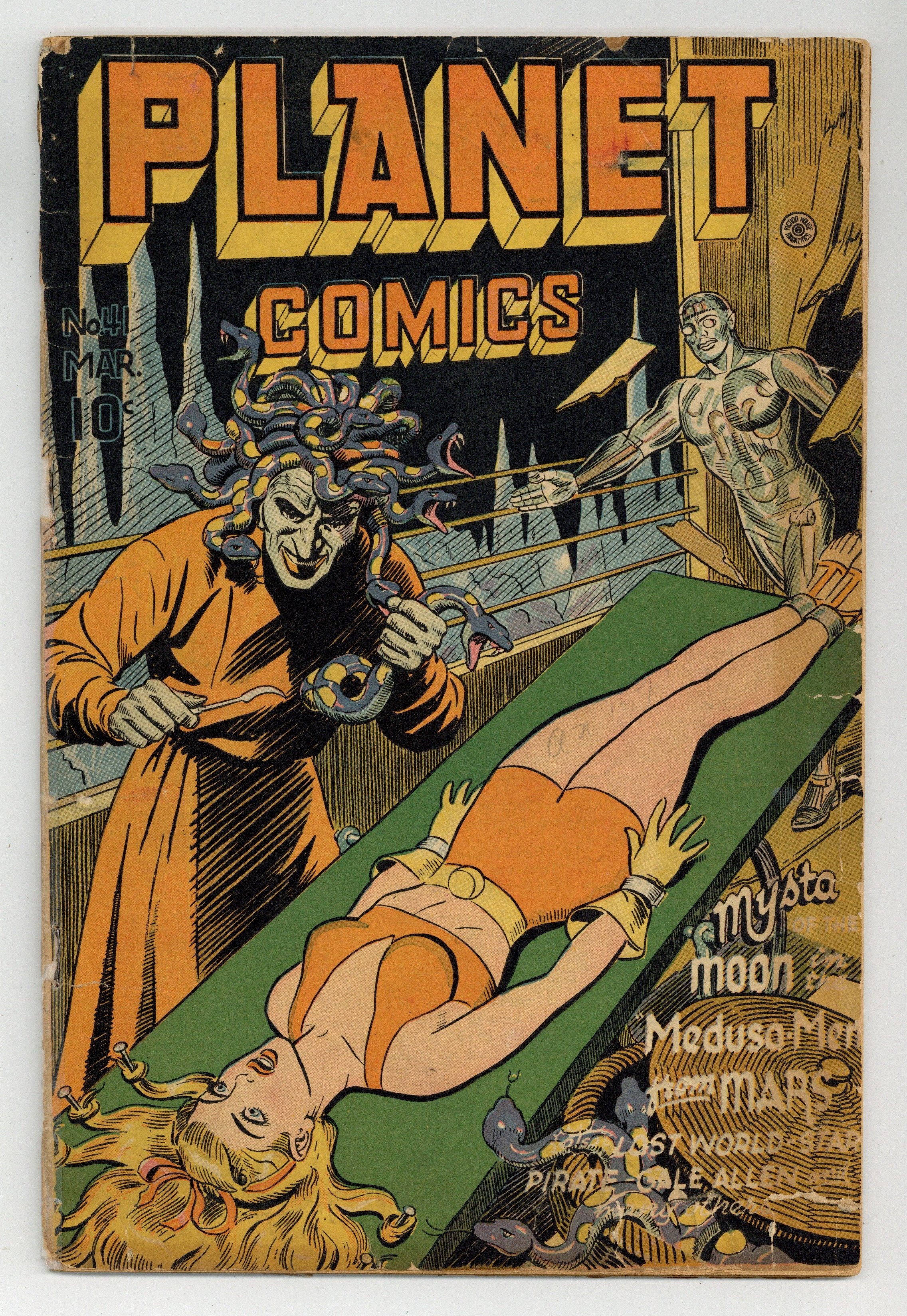 Starts Jan 3 Cover by Joe Doolin. Edited by J. F. Byrne. Stories and art by Lily Renee, Joe Doolin, August Froehlich, Murphy Anderson, and Fran Hopper. The first true science fiction comic, Planet Comics featured classic space opera with square-jawed heroes, rockets, rayguns and bug-eyed aliens of every stripe. The second Auro Lord of Jupiter debuts when the original Auro's body is possessed by a human scientist and transformed into a Flash Gordon-type hero; The Star Pirate takes a spaceship of male colonists to a forgotten world of space women; Gale Allen investigates after the lost planet Itec suddenly returns and begins capturing spaceships. Featuring art by pioneering female artists Fran Deitrick/Hopper and Lily Renee. Classic bondage cover by Joe Doolin. Creatures of the Mind World; The Lost World; Gale Allen; Mysta of the Moon; Auro Lord of Jupiter; Revolt of the Insect World; Space Rangers; The Star Pirate. 52 pages, Full Color. Cover price $0.10.