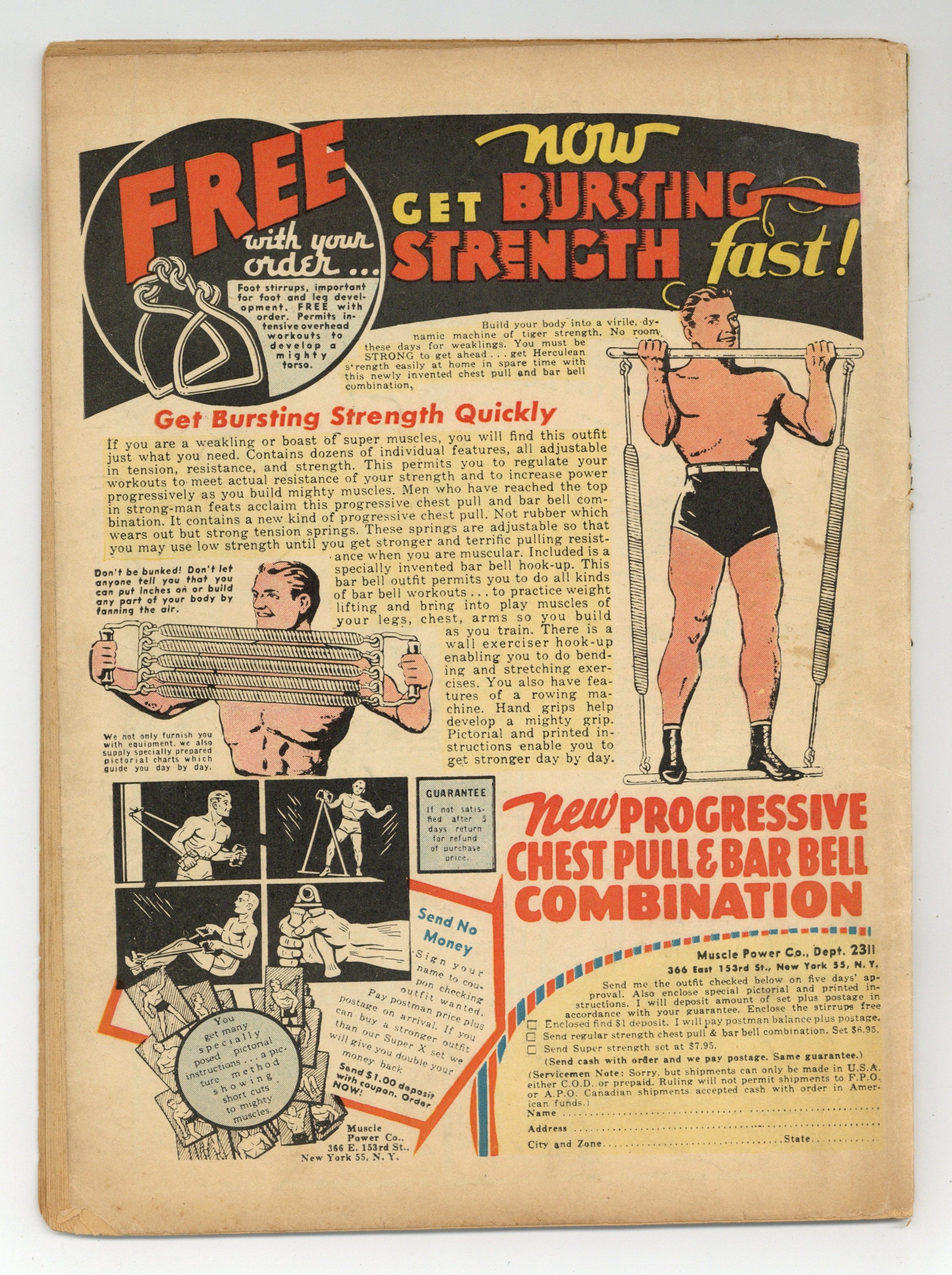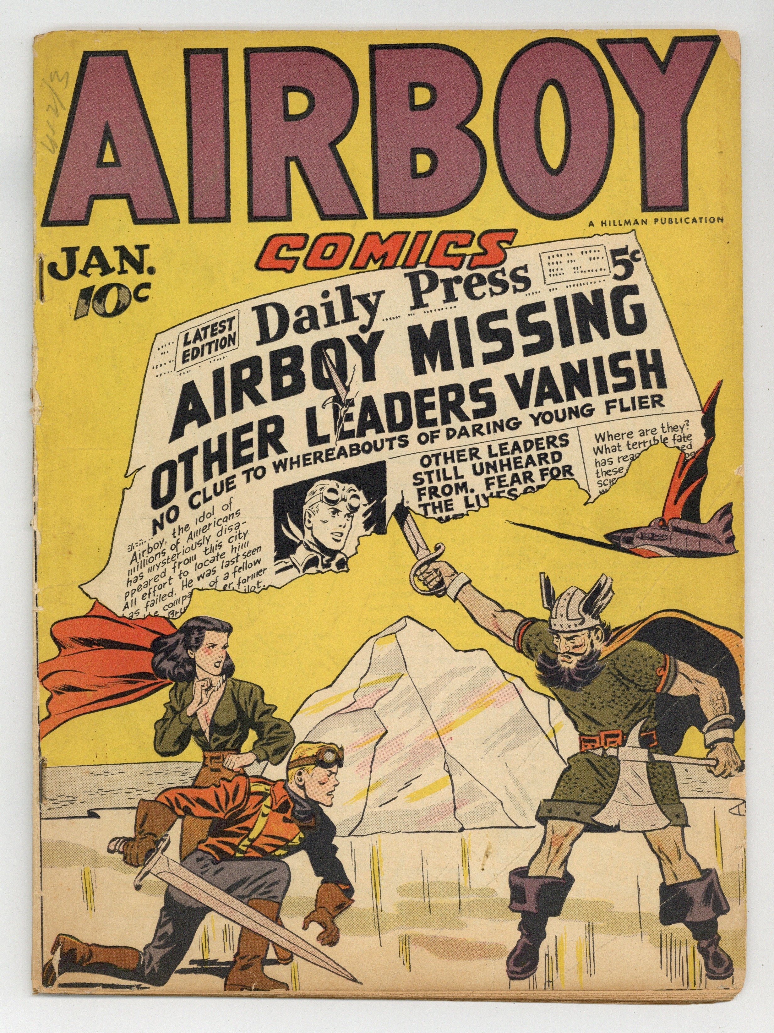 Starts Jan 19 Cover by Fred Kida. Stories and art by Dick Wood, Fred Kida, Tony DiPreta, and Dick Hall. One of the more fanciful and influential of 1940s aviator heroes, Airboy fights evil with his radio-controlled plane "Birdie" and its plethora of experimental flying tech. Sometimes listed as Airboy Comics #35. No issue # on cover; Vol. 3, issue #11 in indicia. When Airboy and Valkyrie are captured by mind-controlling atomic-powered medieval conqueror Black Tamerlane, only fellow Hillman air hero Sky Wolf can save them, in a rare crossover story. The Heap is pursued by a movie producer who sees it as the next great movie monster. Iron Ace investigates The Model Plane Murders. Airboy and Sky Wolf: The Wind of Battle; Skinny McGinty; The Heap: Nature's Prank!; No Trespassing!; Man By the Kitchen Door; Iron Ace. 52 pages, Full Color. Cover price $0.10.