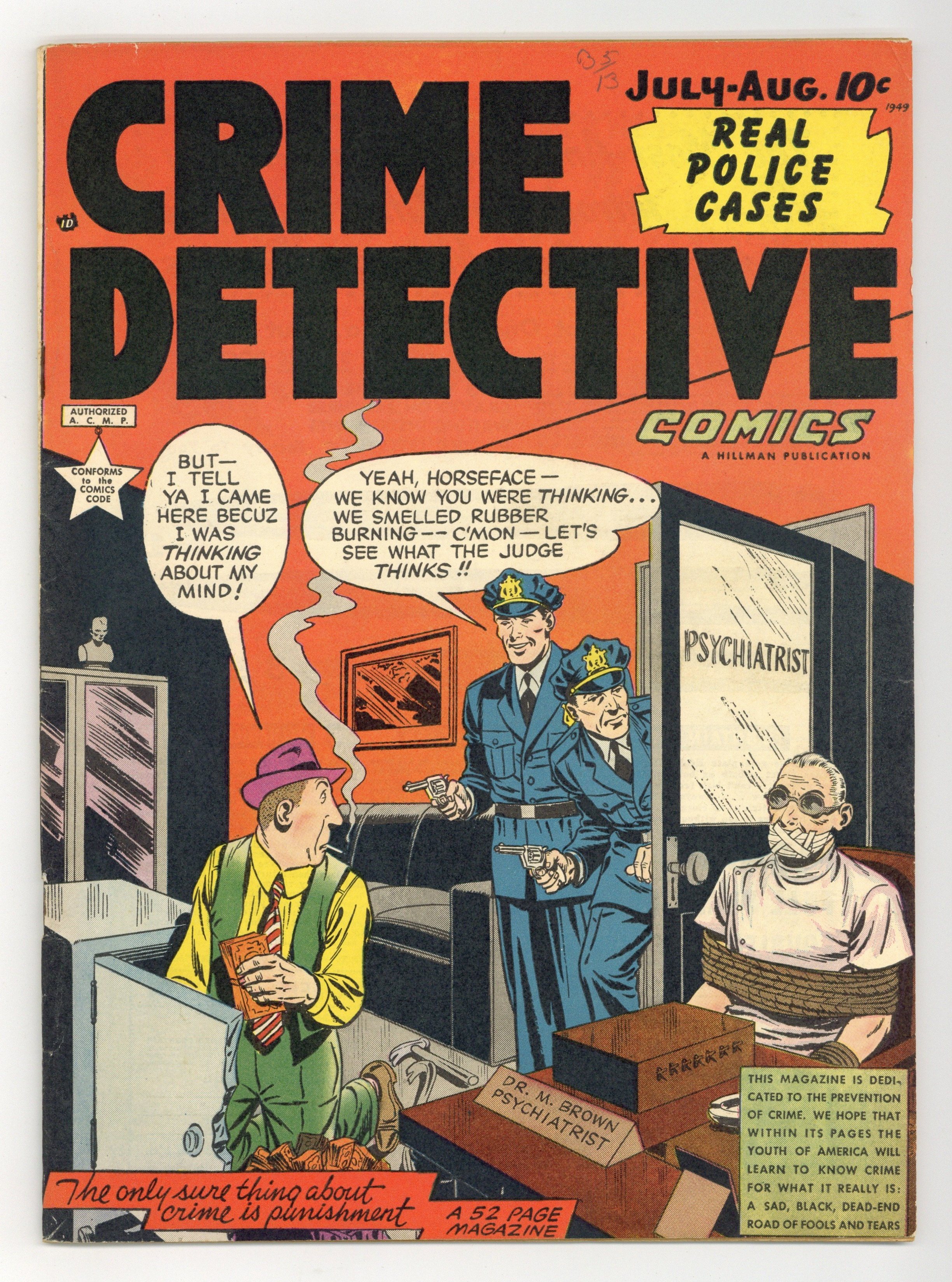 Starts Apr 4 Cover by Dan Zolnerowich and Herb Rogoff. Stories and art by Charles Raab, Art Peddy, Jules Steiner, Jack Keller, and Dan Zolnerowich. Tales of crime and mobsters, both true and fictional, a prime example of the genre that thrived in the years before the Comics Code. The notorious cover of this issue portrays a spoof of anti-comics crusader Dr. Fredric Wertham bound and gagged, something acknowledged by the artists and Wertham himself, who points it out in both the illustrations and text of his 1954 anti-comics classic, Seduction of the Innocent. A female crimelord tries to turn herself and her fellow crooks into high-society types in 1880s New York. Spinster sisters Tabby and Birdie Rosebud, "the 70-year-old teenagers," enter a stock-car race in their ancient jalopy and astound fans and drivers alike with their speed. Beautiful Meat-Hooks; Elmo's Penthouse; No Mice Are Nice; The Apple; Strange Confession; The Rosebud Sisters; Smith Does It Again; The Witness; Corkscrew Alley. 52 pages, Full Color. Cover price $0.10.