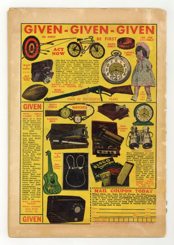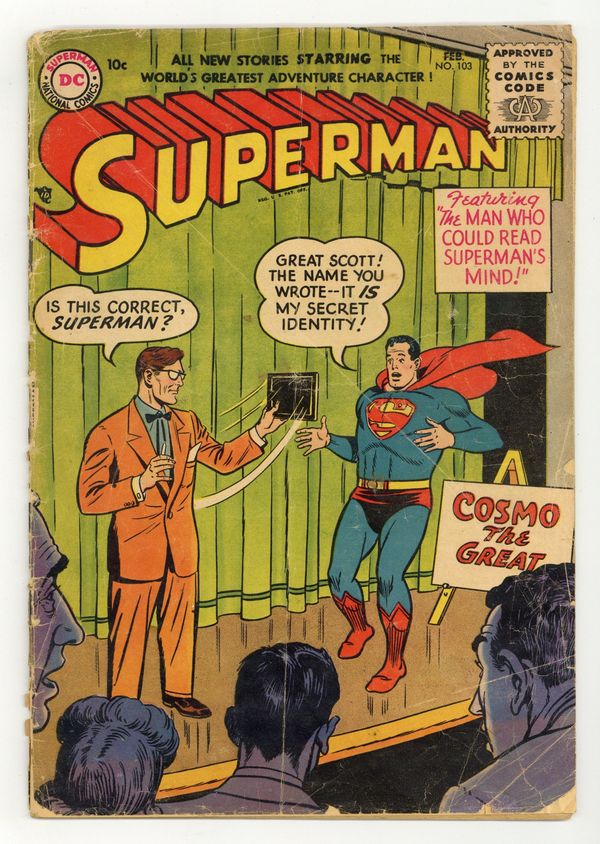 Starts Mar 2 Cover art by Al Plastino. The Superman of Yesterday starring Superman and Jeremy Bird, pencils by Wayne Boring, inks by Stan Kaye. The Revenge of Mr. Mxyztplk (later spelled Mxyzptlk), art by Al Plastino. The Man Who Could Read Superman's Mind, pencils by Wayne Boring, inks by Stan Kaye; The Great Cosmo outs Superman as Clark Kent. 36 Pages, Full Color. Cover price $0.10.