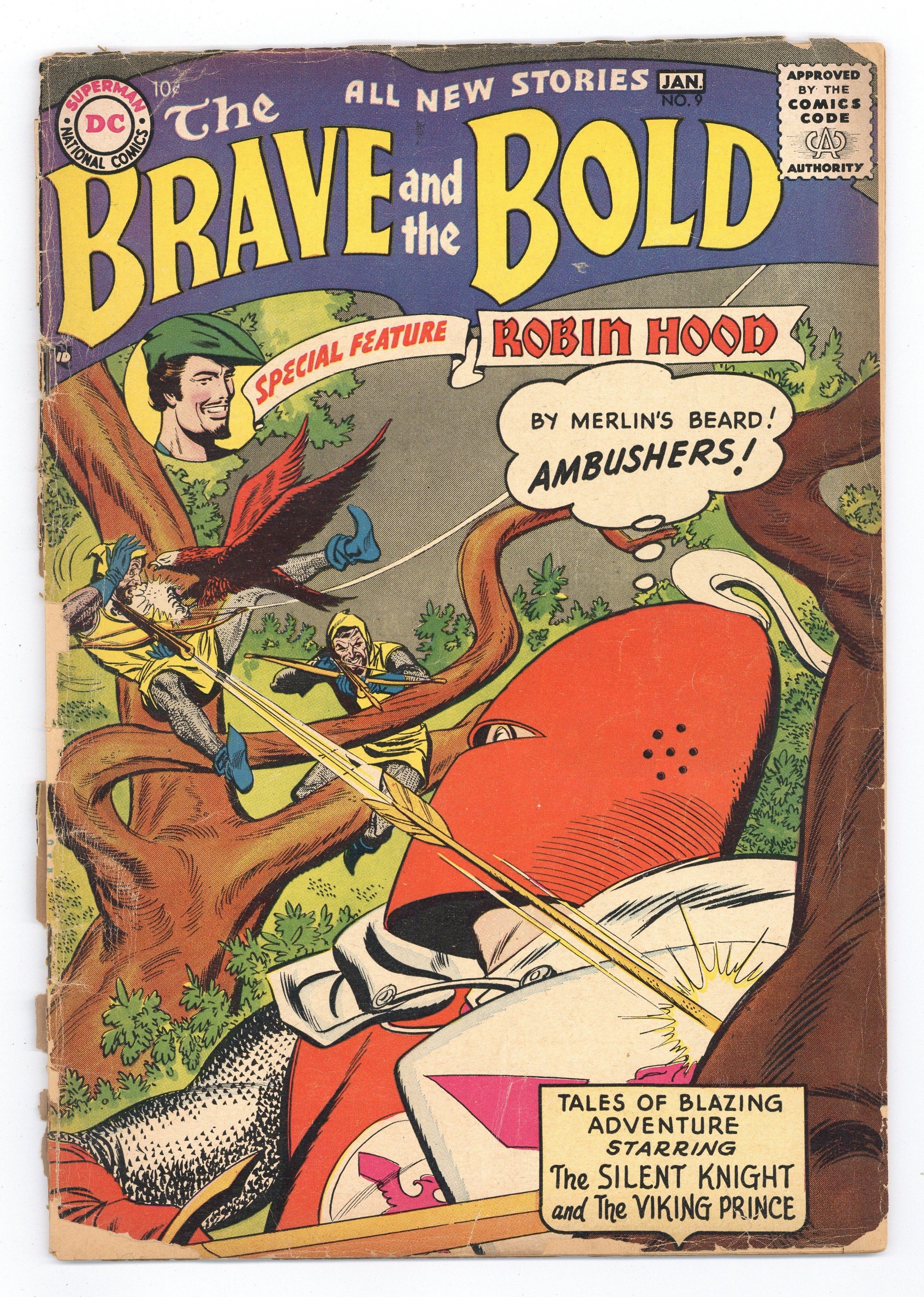 Starts Feb 2 Cover by Irv Novick. "Three Arrows Against Doom!", script by Bob Haney, art by Russ Heath; Robin Hood, disguised as an old trader, tells the story of three different arrows that saved him from trouble. "Peril of the Burning Sea," script by Bob Haney, art by Joe Kubert; During a fishing expedition, Jon and the crew come across a burning face above the water, shooting flames at their vessel!; Captain Olaf and the rest of the crew dub it a fire-troll, but Jon isn't so sure. The First Commandos article by Ross Andru; A brief story about Vikings and their raids. Medieval Games of War article by Jack Miller, art by Raymond Perry; How medieval knights trained for combat. "The Tale of the Falcon and the Stallion," script by Robert Kanigher, art by Irv Novick; Slasher the falcon and Tana the stallion are debating with the forest creatures which of them are more important to the Silent Knight's fight against evil; Slasher's hawk eyes were able to spot an enemy from a mile away, but Tana's hooves have sped his master through many harrowing situations. Facts about the flags of Spain, Alaska and Louisiana. 36 Pages, Full Color. Cover price $0.10.