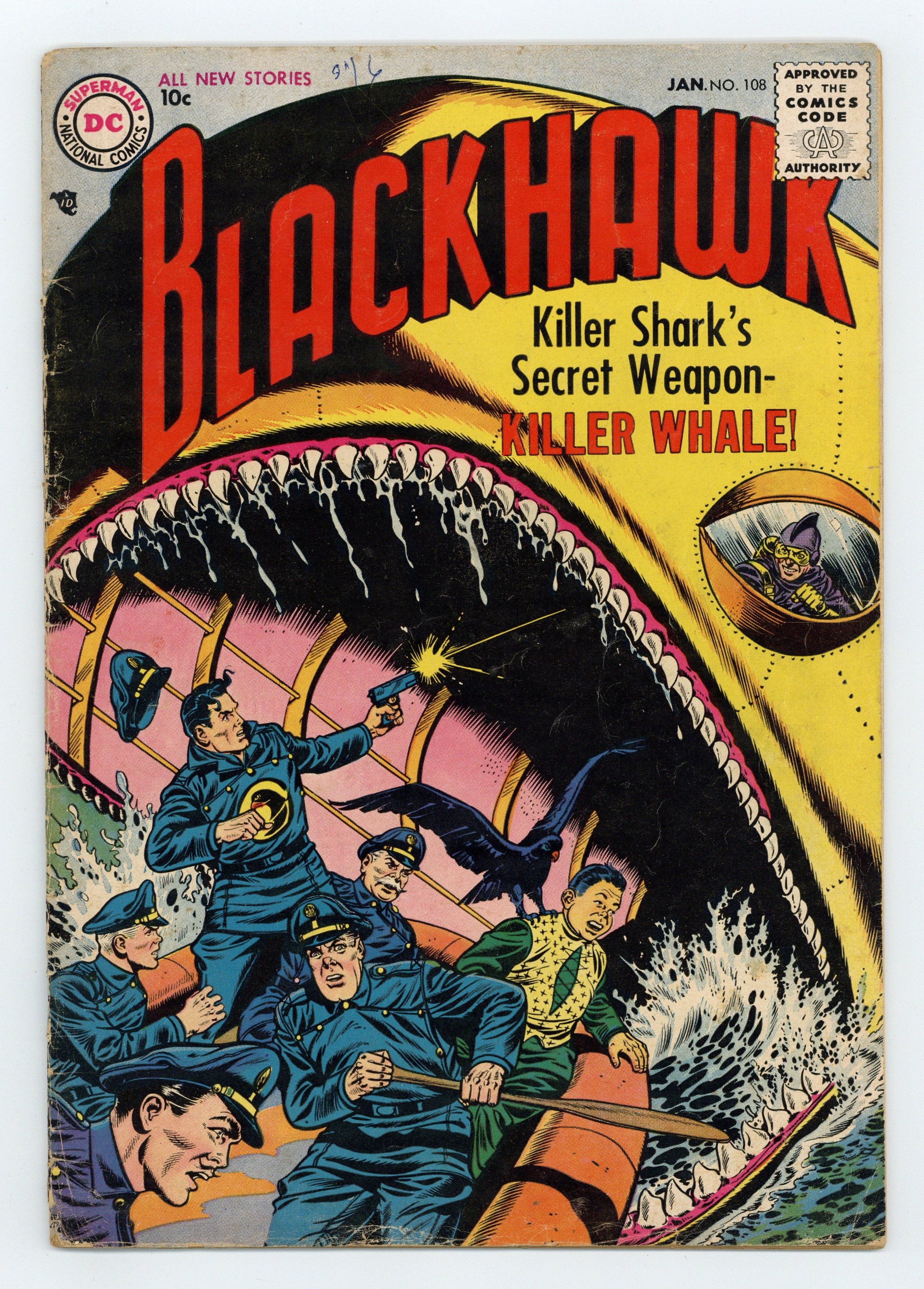 Ends Feb 23 7:41 PM CST Bid History 4 bids Current Bid $23 Your Secret Max Bid If you'd like to bid, please log in or register. First issue published by DC. Re-intro Blackie the Hawk, their mascot. Stories by Robert Bernstein and unknown. Art and Cover by Dick Dillin and Chuck Cuidera. "The Threat from the Abyss!" by Bernstein, Dillin and Cuidera - The Blackhawks become deep sea divers to stop the menace of Dr. Algov, who has been destroying ships with atomic missiles launched from his submarine. Plus: "Killer Shark's Secret Weapon" with art by Dillin and Cuidera - Killer Shark returns, piloting a giant mechanical whale that he uses to capture the Blackhawks. And: "The Mutiny of the Red Sailors" by Bernstein, Dillin and Cuidera -The Blackhawks try to help a group of Communist defectors in Hong Kong, but they turn out to be saboteurs. Also: Shorty 1-pager by Henry Boltinoff; 1-page text story "The Fastest Man on Earth"; and Varsity Vic 1-pager by Henry Boltinoff, reprinted from Date with Judy (1947-1960) #31. 32 pages, full color. Cover price $0.10.