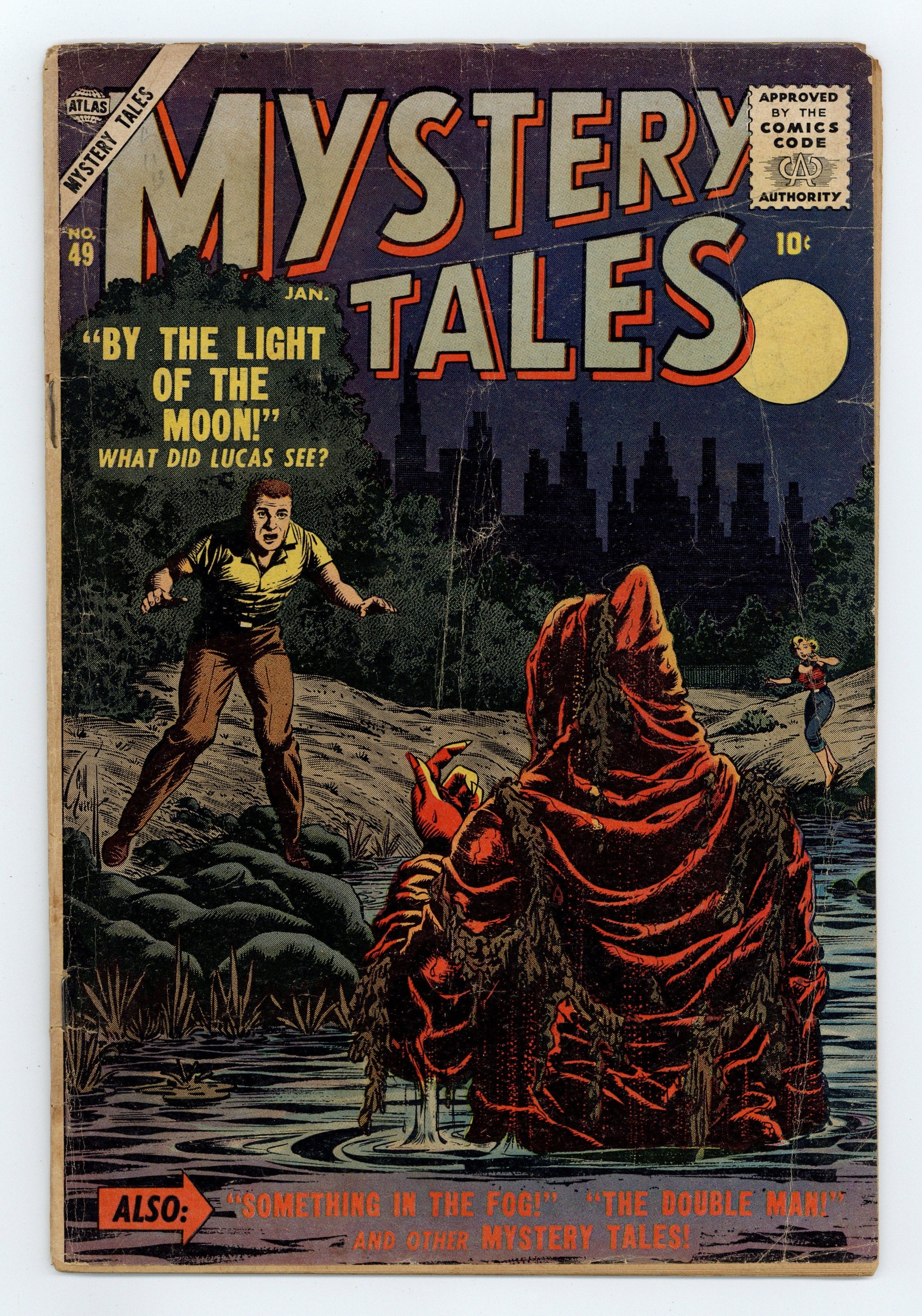 Starts Apr 4 Cover art by Bill Everett. The Double Man!, art by George Roussos. By the Light of the Moon!, art by Bernard Baily. Something in the Fog, art by Dick Ayers. Midnight on the Moors, art by Pete Morisi. Just Your Luck text story. The Tiger's Fangs!, art by Syd Shores. Time without End, art by Robert Q. Sale. 36 pgs. $0.10. Cover price $0.10.