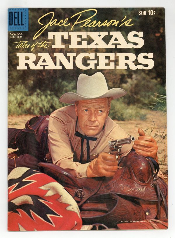 Starts Dec 8 Indicia title is "JACE PEARSON'S TALES OF THE TEXAS RANGERS, No. 1021." Based on the 1955-59 "Tales of the Texas Rangers" TV series. Photo cover of Jace Pearson (as played by Willard Parker). Preview with photos. Hurricane, art by Tony Sgroi; Pearson and Morgan are sent to the Gulf area to investigate the Carlson gang; On the way they are to stop at Stardale to pick up Morgan's nephew Ricky Brian; Before the two can get to Stardale, a hurricane strikes; After taking refuge until the hurricane passes, the Rangers continue to Stardale, finding it hard hit by the hurricane. Pattillo Higgins, art by John Ushler; The story of Pattillo "Bud" Higgins, who was the catalyst for the drilling of the first oil well in Beaumont, Texas, in 1901. Bandit Bait, art by Tony Sgroi; Three outlaws ambush Pearson and Morgan and wound Morgan. Facts about the history of the Texas Rangers during the time of Texas's annexation to the United States. Facts about the first cattle drive through Texas, headed by Oliver Loving, who blazed what would become the "Sedalia Trail." 36 pages, full color. Cover price $0.10.