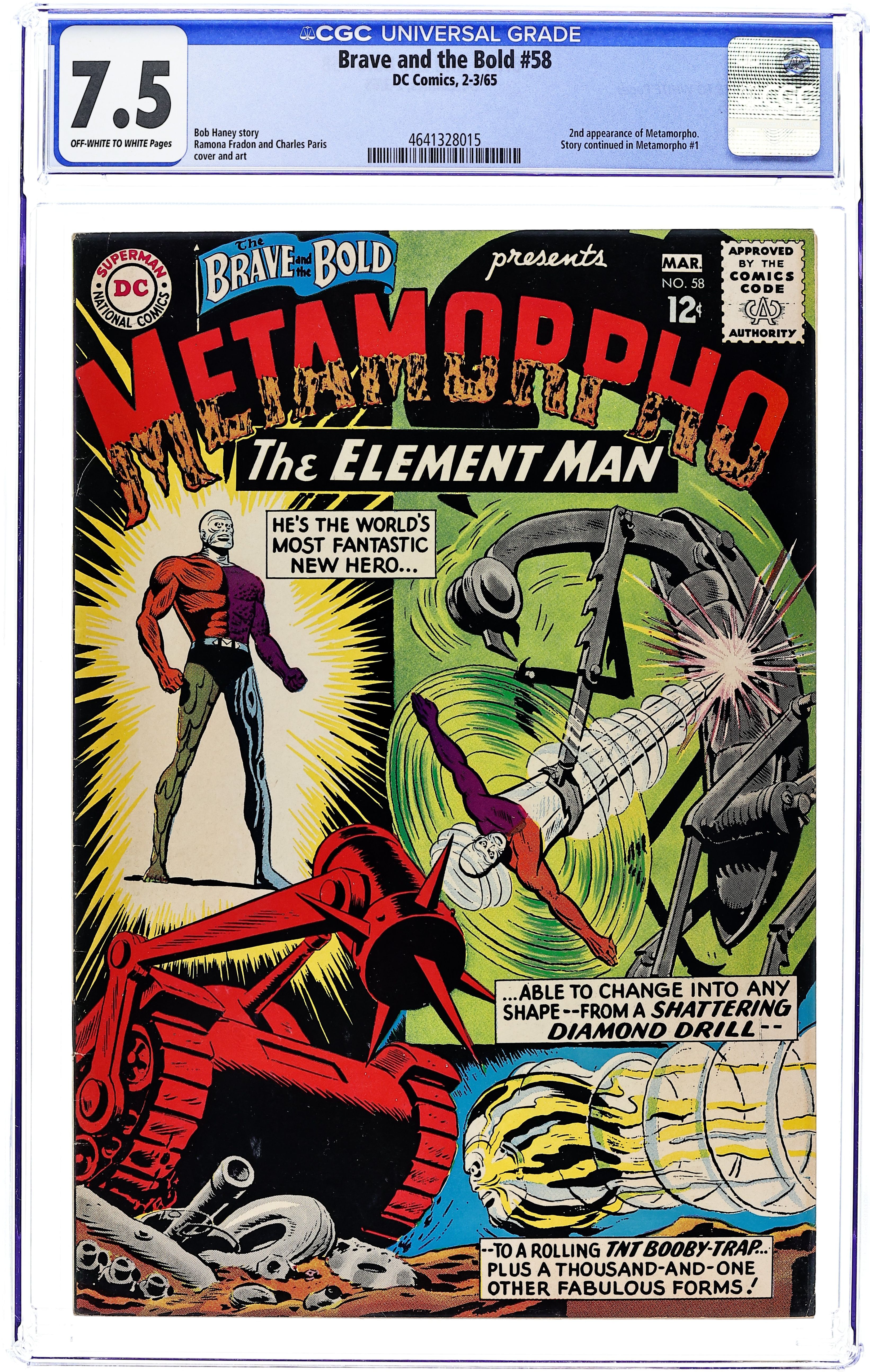 Starts Jan 19 Cover pencils by Ramona Fradon, inks by Charles Paris. 2nd appearance of Metamorpho in "The Junk Yard of Doom," script by Bob Haney, pencils by Ramona Fradon, inks by Charles Paris; World War II-era traitor Maxwell Tremaine kidnaps Metamorpho with the aid of the Orb of Ra, tries to make him repair the broken super-weapons in his "junk yard of doom" for use in world conquest, and ends up battling the Element Man with them when he refuses. Don't Give Fire A Place to Start! public service announcement starring Superboy, script by Jack Schiff, art by Win Mortimer. The Human Chemical Plant article about Metamorpho. From the Inventor's Workbench filler page about a lunch box patent by Henry Boltinoff. 36 Pages, Full Color. Cover price $0.12.