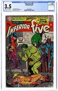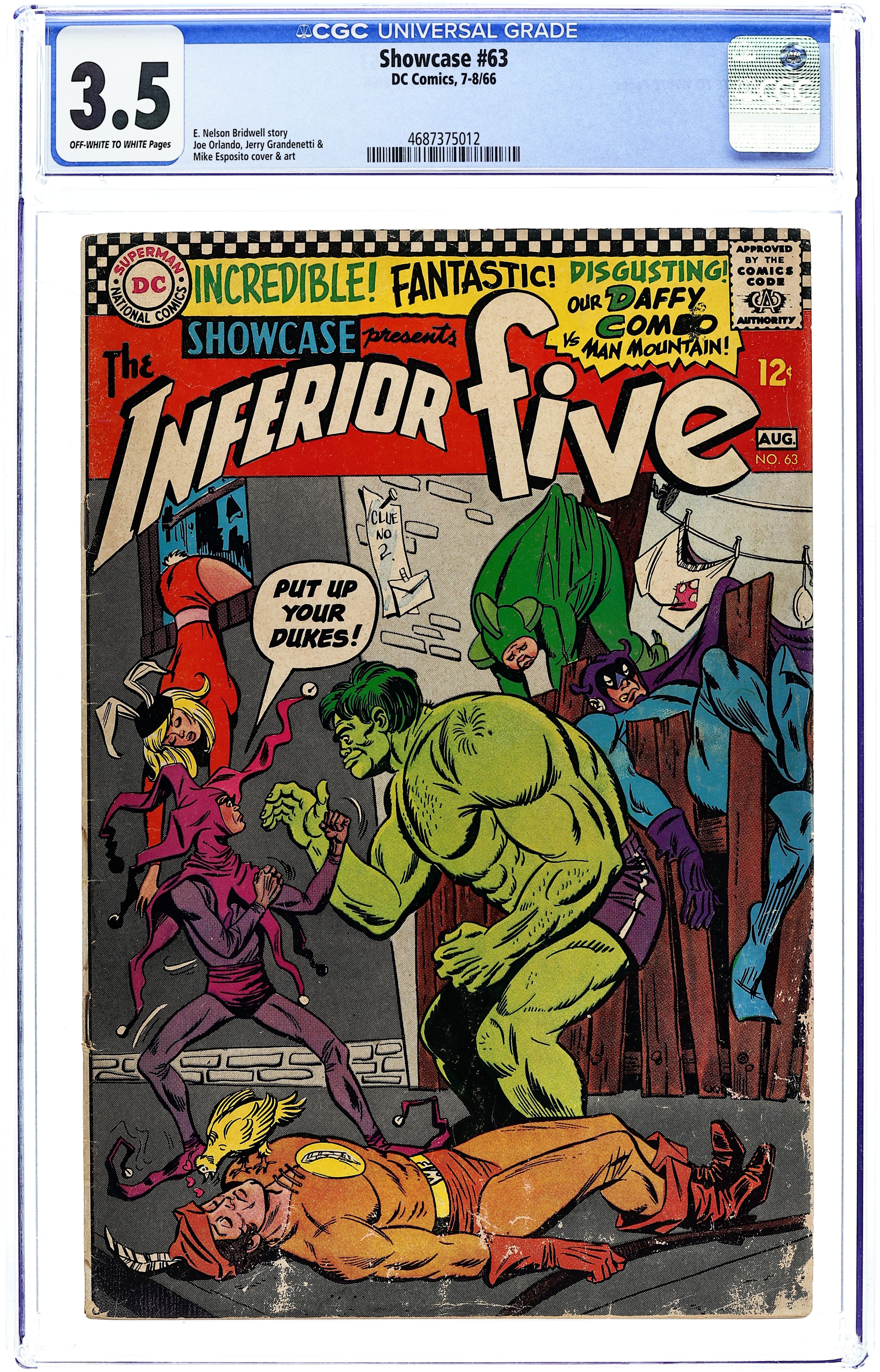 Starts May 4 Cover pencils by Joe Orlando, inks by Mike Esposito. Conquer Man-Mountain -- Because He's There!, script by E. Nelson Bridwell, pencils by Joe Orlando and Jerry Grandenetti, inks by Mike Esposito; The Masked Swastika assembles his old gang, formerly enemies of the Freedom Brigade, and with the help of the Silver Sorceress they are all rejuvenated; Unfortunately, the Brigade is retired and only their children, the Inferior 5, are available to stop the villains. Oh, No! Not Another Green-Skinned Monster!, script by E. Nelson Bridwell, pencils by Joe Orlando, inks by Mike Esposito. Merryman's Last Stand, script by E. Nelson Bridwell, pencils by Joe Orlando, inks by Mike Esposito. Stories include parodies of Iron Man and the Hulk. Statement of ownership--average print run 388,000; average paid circulation 234,000. 36 Pages, Full Color. Cover price $0.12.