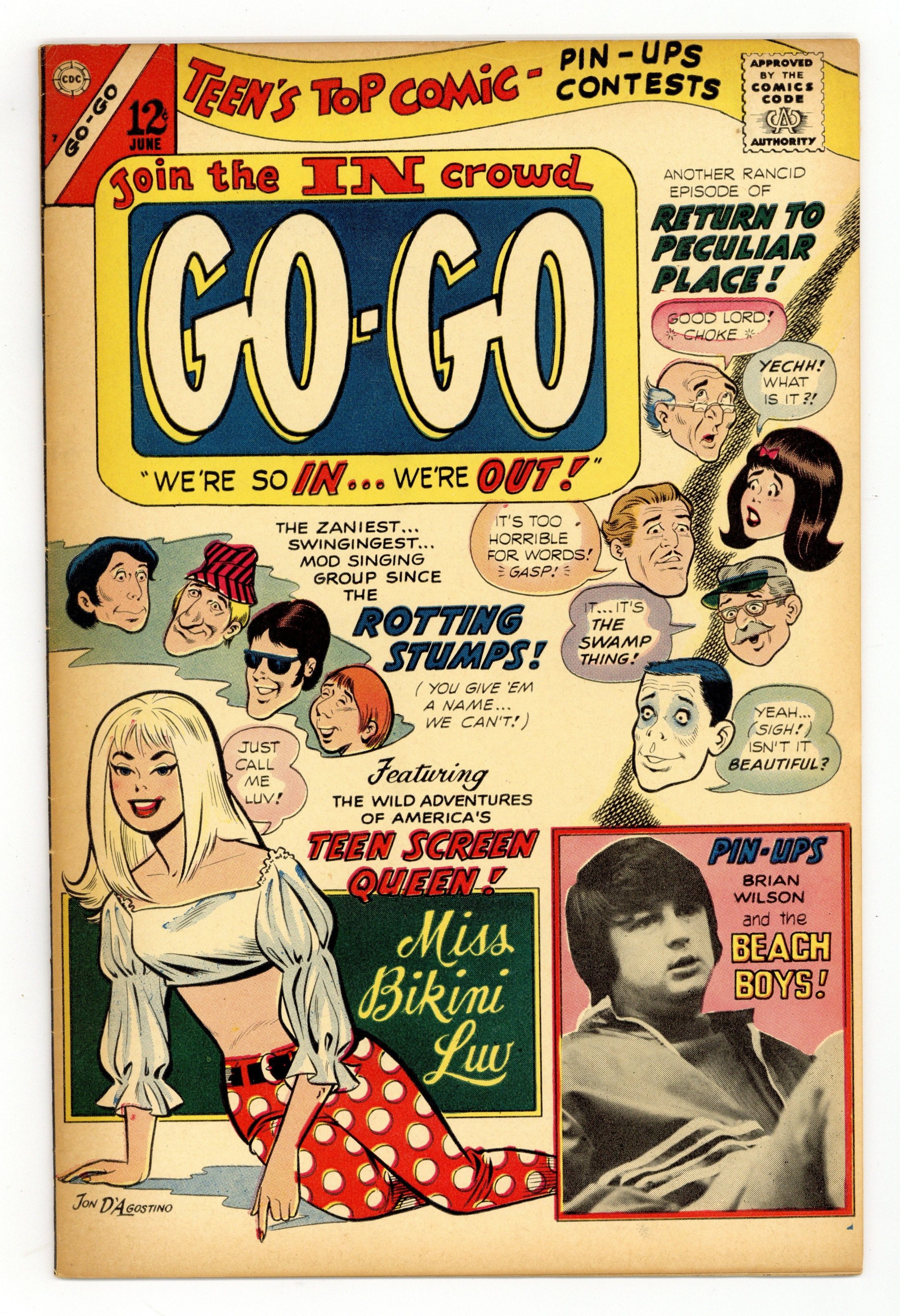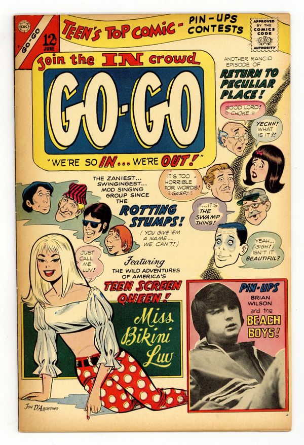 Starts May 4 Cover by Jon D'Agostino. Stories and art by Denny O'Neil, Jim Aparo, Grass Green, Steve Skeates, D. J. Arneson, Mo Marcus and Rocco "Rocke" Mastroserio. Charlton's mid-'60s attempt at a "hip" teen comic results in a sort of combination of Archie's Madhouse, the lesser Mad clones, and Teen Beat. The Far Out Fairy Tales tell the stories of "Superella" and "Snow What." Go-Go's parody of the "Peyton Place" soap opera goes on and on.... This issue features early work by legendary comics scribes Denny O'Neil and Steve Skeates, and art by future Batman artist Jim Aparo and underground comix legend Richard "Grass" Green. Photos of rock legends Beach Boys and Brian Wilson. The Beach Boys; A Far Out Fairy Tale: The Swingin' Saga of Superella: Part II; Return to Peculiar Place; Record Breaker; The First Argument; Rendezvous; The Wild Life and Adventures of Miss Bikini Luv; Snow What, a Far-Out Fairy Tale. 32 pages, Full Color. Cover price $0.12.