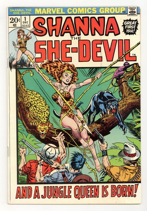 Starts Feb 9 Cover art by Jim Steranko. "Shanna the She-Devil!", script by Carole Seuling and Steve Gerber, pencils by George Tuska, inks by Vince Colletta; The origin of Shanna; Shanna O'Hara Plunder is the daughter of a diamond miner; Born in Africa, she spent her childhood in the jungles of Zaire; After Shanna's father accidentally kills her mother, Shanna moves back to the United States to live with relatives, and Shanna grows up to become an accomplished athlete and then becomes a zoologist; She returns to Africa and patrols the jungle living freely with the land. 36 pgs., full color. Cover price $0.20.