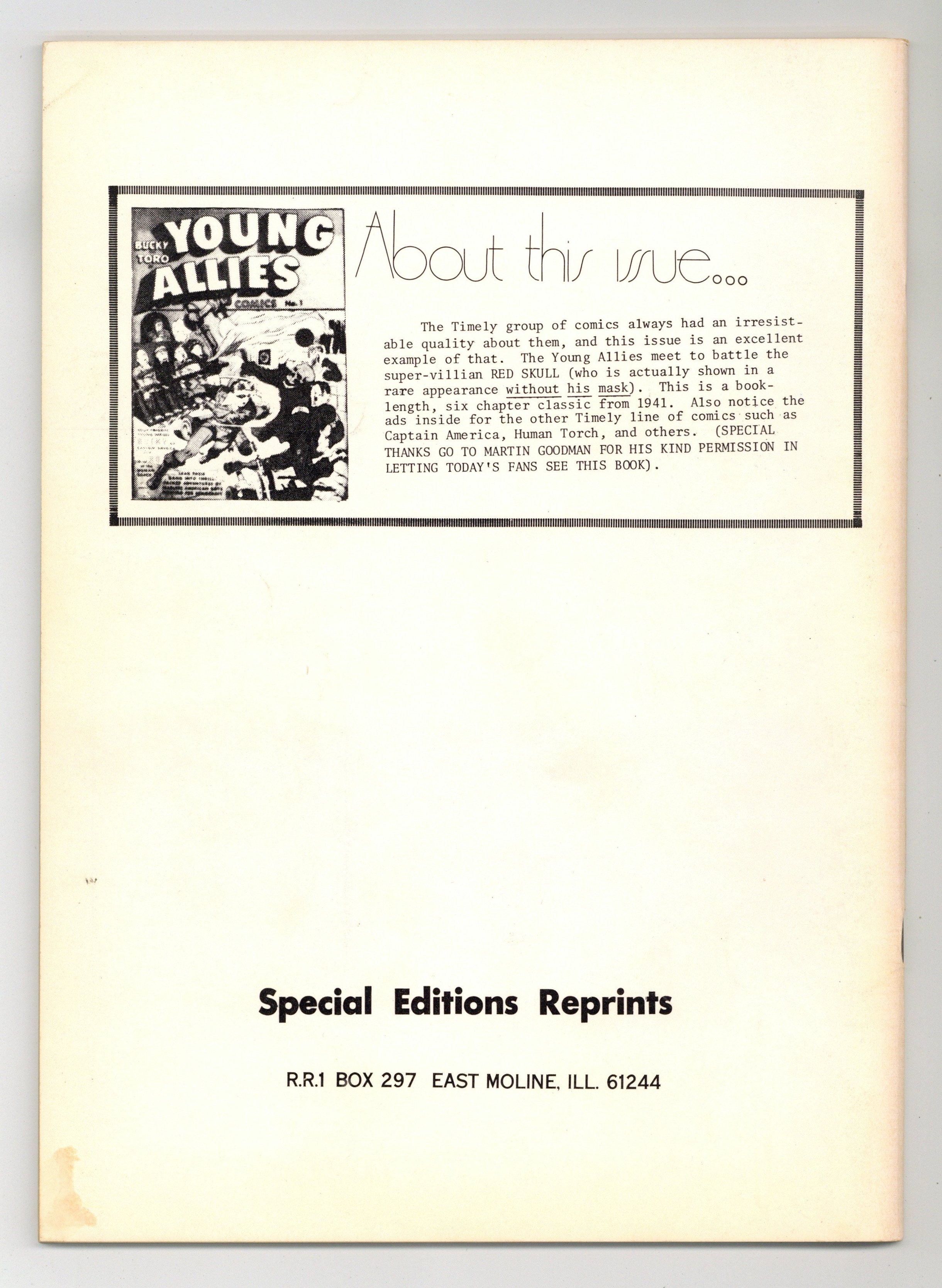 Starts Feb 23 The eighth issue of the Flashback reprint series presents YOUNG ALLIES # 1 originally published in 1941 by Timely Comics (now Marvel). Featuring the Red Skull. 68-pages, full color cardstock covers, 7-3/4-in. x 10-3/8-in., black-and-white interior on white paper stock, saddle-stitched binding. Cover price $3.00.