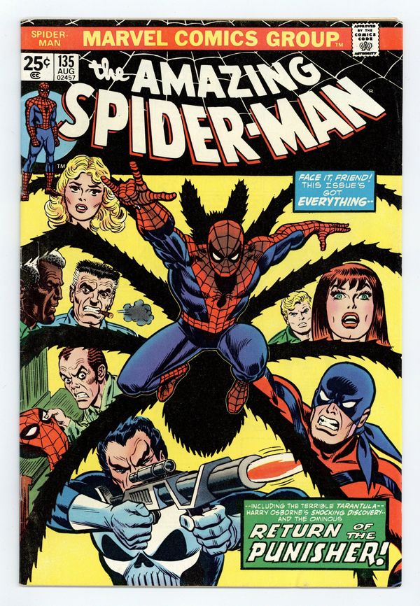Starts May 11 Second (full) appearance of the Punisher in "Shoot-Out in Central Park!" Part 2 of 2. Guest-starring the Punisher. Script by Gerry Conway. Pencils by Ross Andru. Inks by Frank Giacoia. Cover by John Romita. Out of the blue, the Punisher appears on the deck of the day-liner...with the Amazing Spider-Man dead in his sights! Oh no! Does Frank Castle know the Tarantula is the actual bad guy onboard? After a brief scuffle, the web-slinger and the Punisher agree to work together; but the Tarantula has already jumped ship. Several hours later in Central Park, the wall-crawling hero and the gun-toting anti-hero join forces...to tame the Tarantula! In the meantime, Harry Osborn discovers a spider-suit in Peter Parker's dresser. And big trouble is ahead next issue! Origin of the Tarantula. Cameo appearances by Mary Jane Watson, Flash Thompson, Liz Allan, J. Jonah Jameson, and Joe Robertson. (Notes: The Punisher returns in Giant-Size Spider-Man #4. The letters page includes a letter from comics editor Steve Saffel. The letters page also includes Marvel Value Stamp series A #4 Thing (of the FF) by John Buscema and Joe Sinnott. This issue was reprinted in Marvel Tales 112 and again in issue 211.) 32 pages. Cover price $0.25.