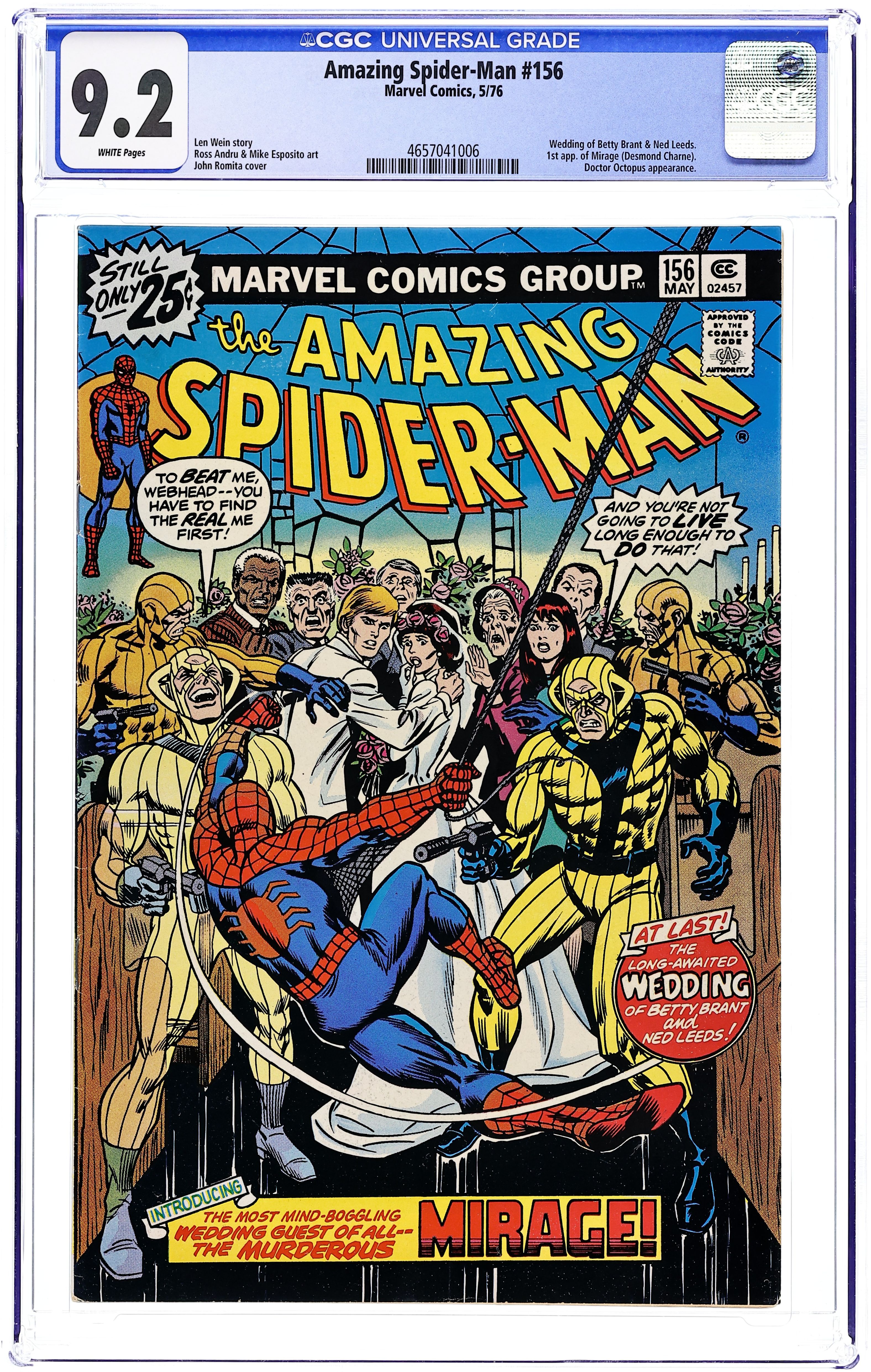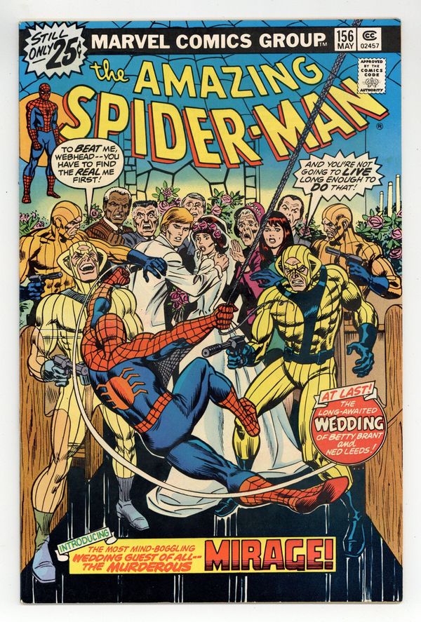 Ends Dec 8 7:18 PM CST Bid History 4 bids Current Bid $9 Your Secret Max Bid If you'd like to bid, please log in or register. "On a Clear Day, You Can See...The Mirage!" Script by Len Wein. Pencils by Ross Andru. Inks by Mike Esposito and Dave Hunt (backgrounds). Cover by John Romita. Wedding bells ring in the pages of the Amazing Spider-Man! As Peter's former girlfriend (Betty Brant) and the web-slinger's future foe (Ned Leeds aka the Hobgoblin) tie the knot! The joyous ceremony proceeds as planned until a wedding crasher shows up! The Mirage! And he's not just looking for free hors d'oeuvres! Can the wall-crawler see through the Mirage and restore Betty and Ned's happy day? First Appearance of the Mirage. Appearances by Aunt May, Anna Watson, Mary Jane Watson, Flash Thompson, Harry Osborn, Liz Allan, J. Jonah Jameson, Joe Robertson, and Doctor Octopus. (Notes: The Mirage appears next in Marvel Two-in-One 96. The letters page includes Marvel Value Stamp series B #83 the Incredible Hulk. This story was reprinted in Marvel Tales 133. A 30-cent cover price variant exists for this issue.) 36 pages. Cover price $0.25.