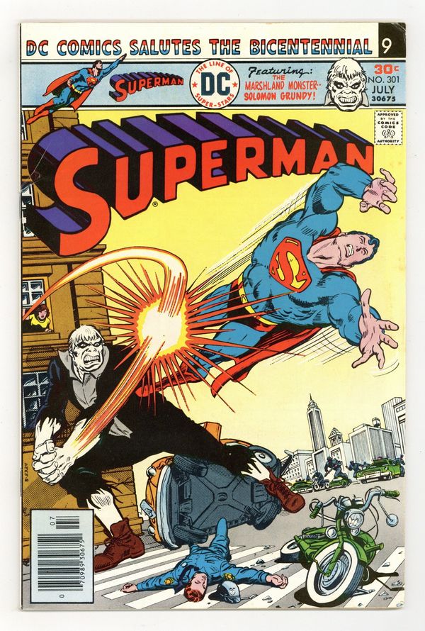 Starts Mar 2 Mark Jeweler Advertisement Insert Variant. Cover pencils by Jose Luis Garcia-Lopez, inks by Bob Oksner (figures) and Bob Wiacek (backgrounds). Solomon Grundy Wins on a Monday!, script by Gerry Conway, pencils by Jose Luis Garcia-Lopez, inks by Bob Oksner (figures), Terry Austin (backgrounds, pages 2-7, 10-19), and Bob Wiacek (backgrounds, pages 1, 8-9, 20-30); Solomon Grundy gets the best of Superman and goes on a search for another version of himself. 36 pgs. $0.30. Cover price $0.30.